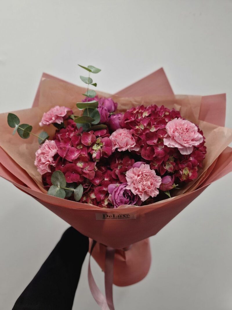 Wplecione goździki dodają intensywności zarówno pod względem zapachu, jak i faktury – ich falujące płatki tworzą piękny kontrast wobec gładkości hortensji. Kolorystyka bukietu może być utrzymana w pastelowych tonacjach (np. pudrowy róż, biel, mięta), co podkreśla romantyczny i elegancki charakter całości.