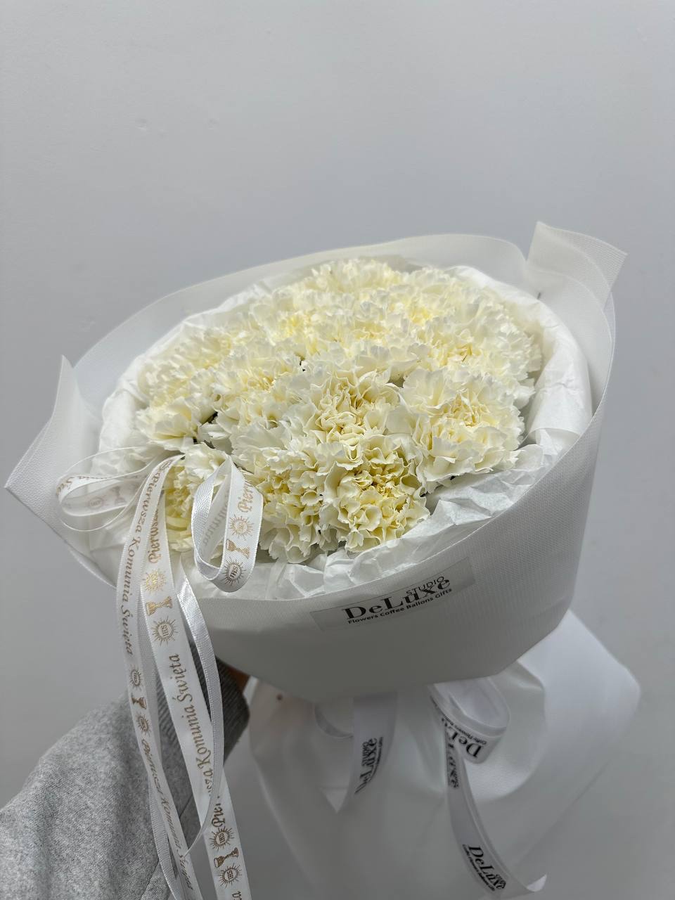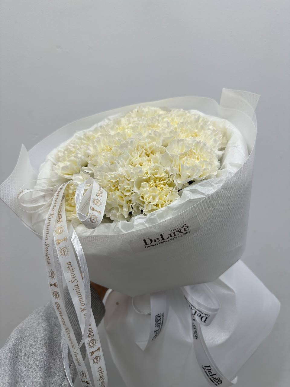 Bukiet na Komunię biały – elegancka kompozycja z goździków. Idealny prezent komunijny. Dostawa w Poznaniu.