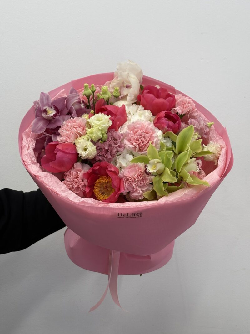 Bukiet z kwiatów mieszanych hortensji, piwonii, goździków, cymbidium, eustomy