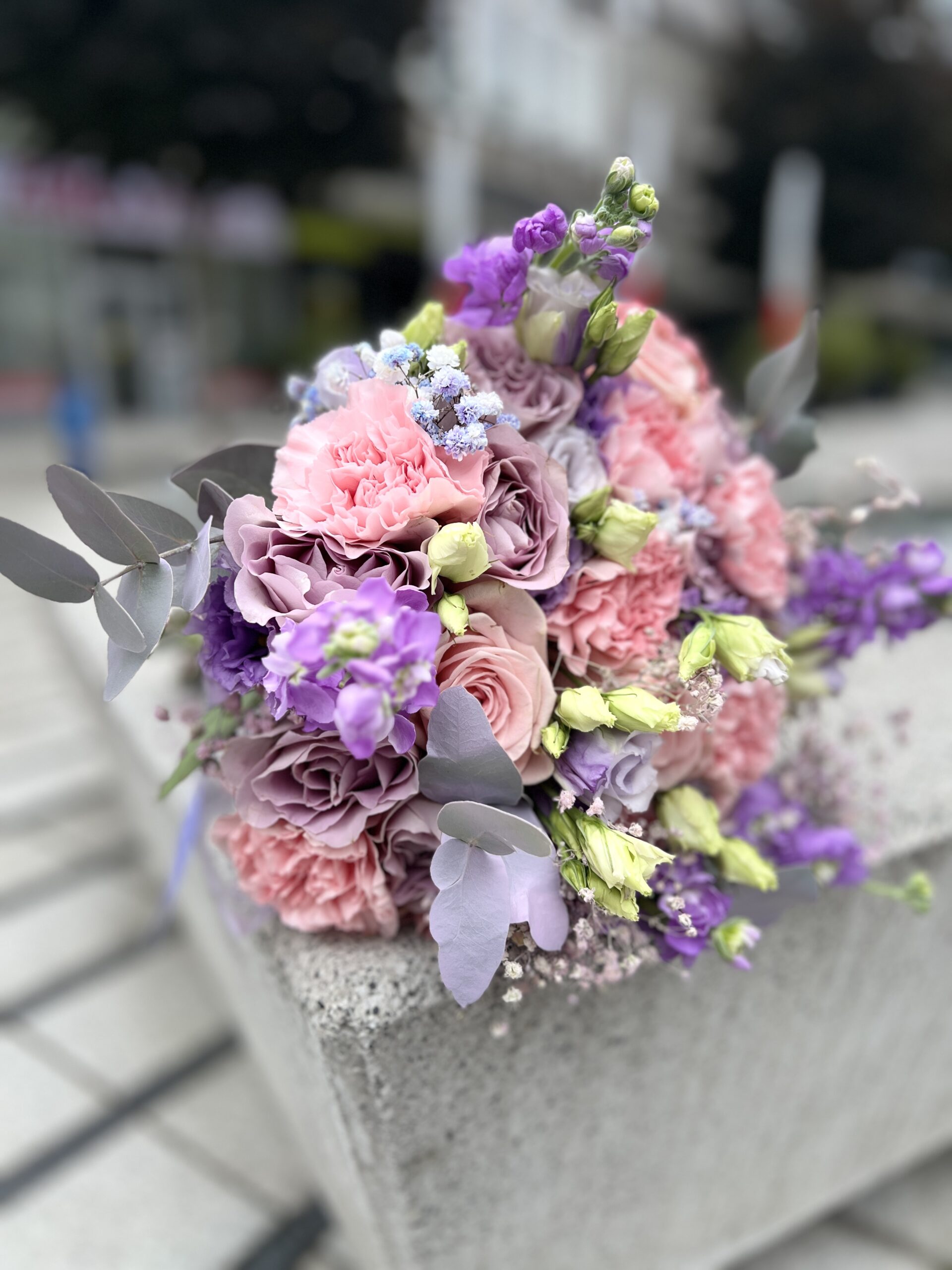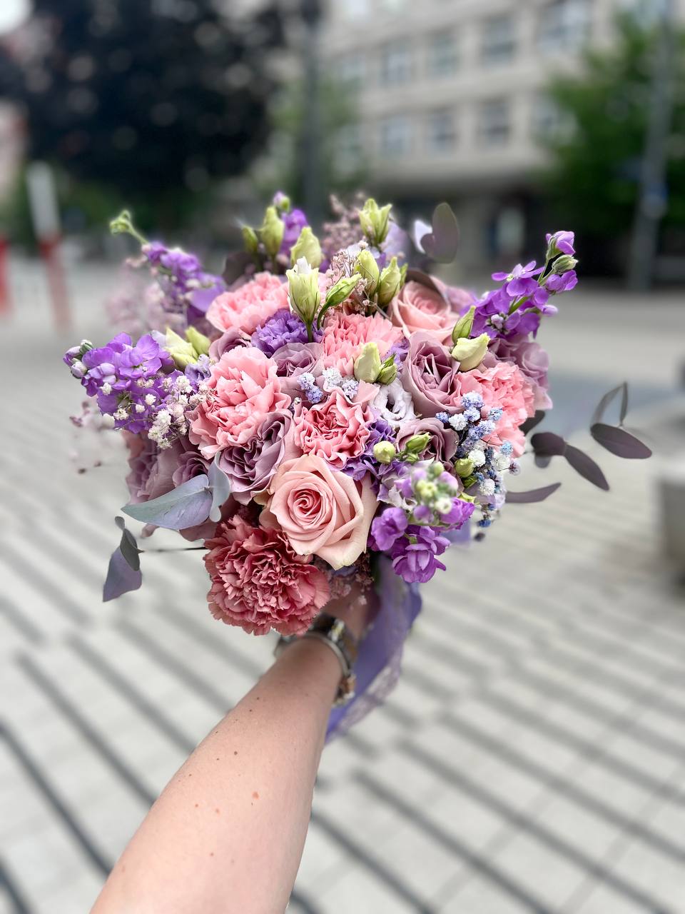 Bukiet ślubny pastelowy z róż, goździków i eustomy to romantyczna i delikatna kompozycja, stworzona z myślą o wyjątkowych chwilach. Subtelne odcienie różu, fioletu i kremowej bieli tworzą harmonijny bukiet o lekkim, eleganckim charakterze. W skład bukietu ślubnego pastelowego wchodzą róże, goździki, eustoma, kwiaty sezonowe oraz dekoracyjna zieleń (np. eukaliptus). Jeśli szukasz więcej inspiracji, zobacz nasze bukiety mieszane oraz eleganckie monobukiety. Róże nadają kompozycji klasy i romantycznego charakteru, goździki wprowadzają miękkość i objętość, a eustoma podkreśla lekkość i naturalność. Całość tworzy bukiet ślubny pastelowy, który idealnie wpisuje się w styl boho, garden oraz klasyczny. Bukiet ślubny pastelowy doskonale komponuje się z jasną suknią ślubną oraz naturalnymi dekoracjami. Jest lekki, wygodny i pięknie prezentuje się na zdjęciach, tworząc spójną i elegancką całość. Każdy bukiet przygotowywany jest indywidualnie z najświeższych kwiatów, dlatego może się nieznacznie różnić, zachowując jednak pastelowy styl i estetykę. Do bukietu możesz dobrać dodatki, takie jak balony, słodycze lub pluszaki, aby stworzyć wyjątkowy zestaw. Zobacz więcej realizacji: @studiodeluxe_pl Na zdjęciu bukiet ślubny pastelowy z róż, goździków i eustomy z dodatkiem zieleni dekoracyjnej.