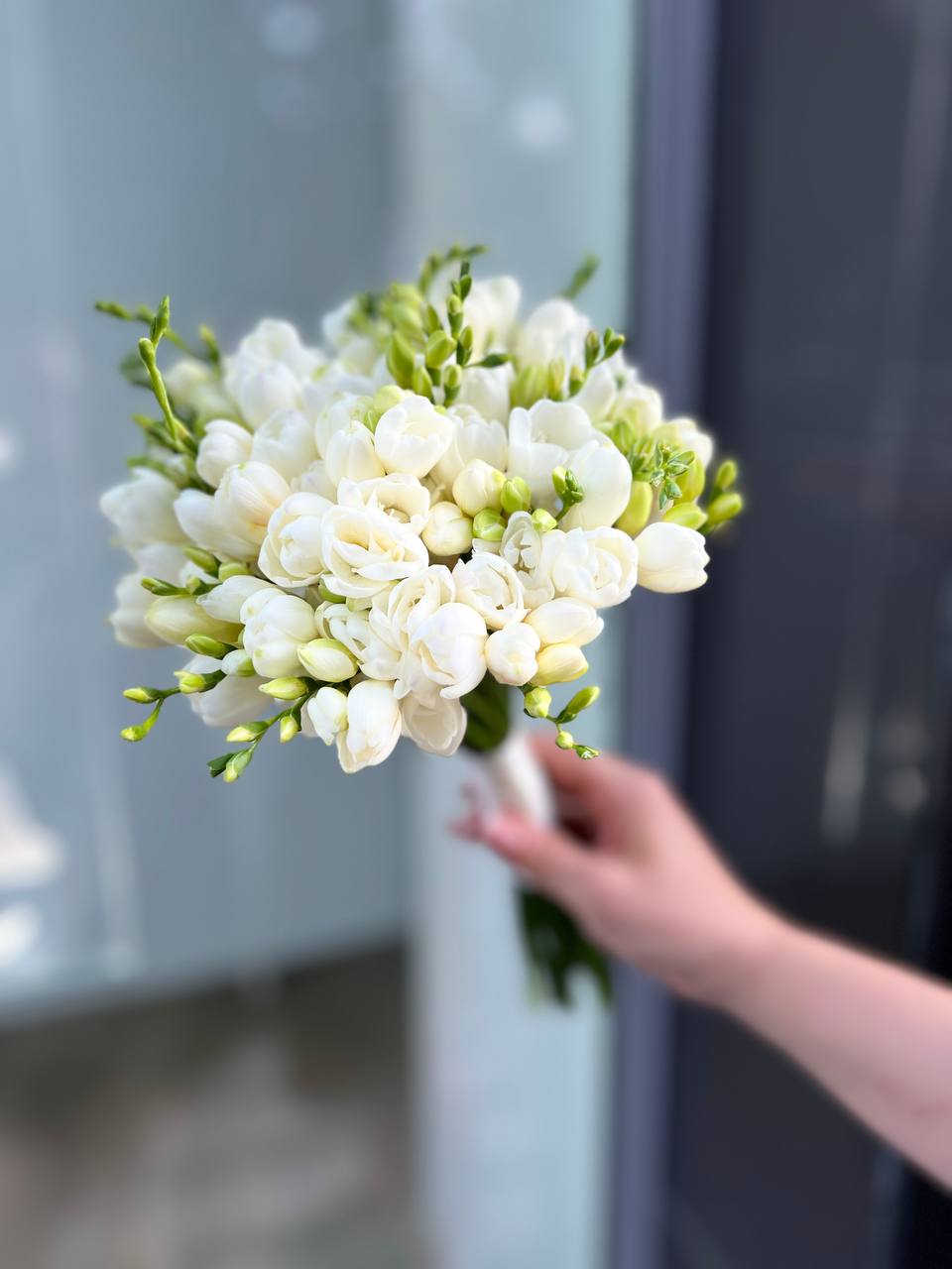 Bukiet ślubny z frezji białej – delikatny, pachnący i elegancki. Idealny dla panny młodej. Dostawa kwiatów Poznań.
