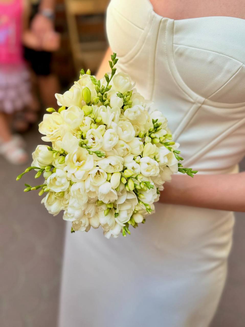 Bukiet ślubny to elegancka i niezwykle subtelna kompozycja, która zachwyca swoją lekkością oraz naturalnym urokiem. Śnieżnobiałe frezje tworzą harmonijną, delikatną formę, idealnie wpisującą się w romantyczny charakter ceremonii ślubnej. Bukiet ślubny z frezji białej składa się wyłącznie z frezji, dzięki czemu zachowuje minimalistyczny i ponadczasowy styl. Jeśli szukasz więcej inspiracji, sprawdź nasze monobukiety oraz eleganckie bukiety mieszane. Frezja symbolizuje niewinność, czystość oraz zaufanie, dlatego bukiet ślubny z frezji białej jest jednym z najczęściej wybieranych rozwiązań przez panny młode. Jej delikatny, przyjemny zapach dodatkowo podkreśla wyjątkowość chwili. Bukiet  z frezji białej doskonale komponuje się z klasyczną suknią ślubną, stylizacjami w stylu boho, a także nowoczesnymi, minimalistycznymi aranżacjami. To idealny wybór na ślub, sesję zdjęciową oraz eleganckie przyjęcia. Każdy bukiet przygotowywany jest indywidualnie z najświeższych kwiatów, dlatego może się nieznacznie różnić, zachowując jednak swój charakter i formę. Do bukietu możesz dobrać dodatki, takie jak balony, słodycze lub pluszaki, aby stworzyć wyjątkowy zestaw. Zobacz więcej realizacji: @studiodeluxe_pl Na zdjęciu bukiet ślubny z białej frezji w formie okrągłej kompozycji.