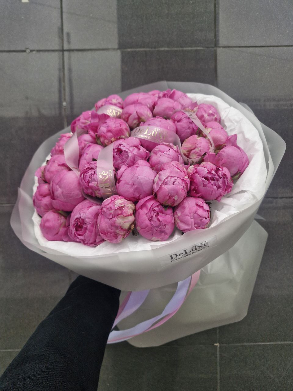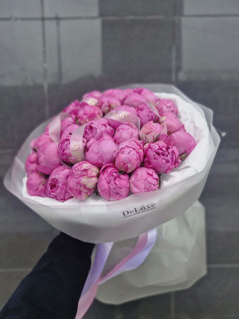 Kompozycja została starannie ułożona przez florystów Studio Deluxe i zapakowana w jasne, minimalistyczne opakowanie, które podkreśla naturalną urodę piwonii i ich intensywny odcień różu.