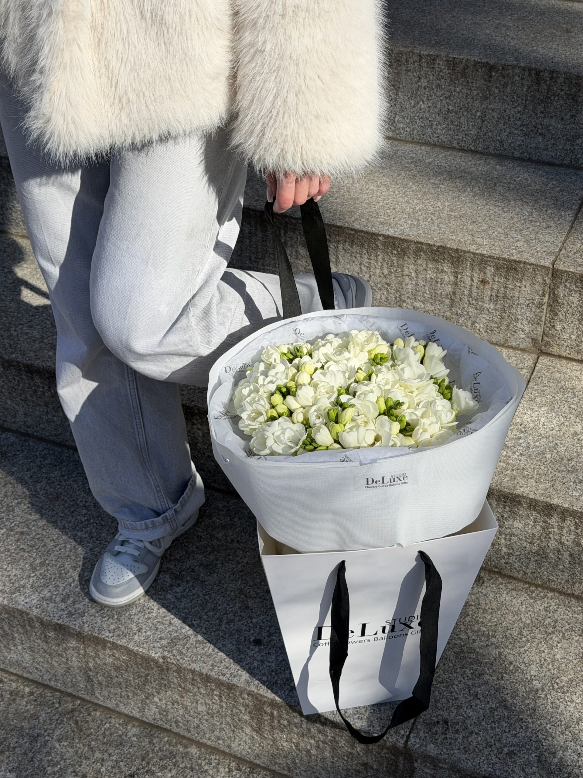 Bukiet z białej frezji to wyjątkowo delikatna i elegancka kompozycja, która zachwyca subtelnym wyglądem oraz pięknym, świeżym zapachem. Śnieżnobiałe kwiaty frezji symbolizują czystość, niewinność i szczerość, dlatego bukiet doskonale sprawdzi się jako prezent pełen emocji i dobrych intencji. Frezja wyróżnia się lekką, naturalną formą oraz charakterystycznymi, drobymi kwiatami rozwijającymi się wzdłuż łodygi. Dzięki temu bukiet wygląda bardzo świeżo i romantycznie, a jednocześnie zachowuje elegancki i minimalistyczny styl. To idealna propozycja dla osób ceniących subtelne kompozycje kwiatowe. Bukiet z białej frezji świetnie sprawdzi się na urodziny, imieniny, rocznicę, Dzień Kobiet, a także jako bukiet ślubny lub dodatek do dekoracji. Jasna kolorystyka sprawia, że kompozycja pasuje do każdej okazji i wnosi lekkość oraz świeżość. Jeśli szukasz więcej inspiracji, zobacz nasze monobukiety lub stylowe bukiety mieszane. Dodatkowym atutem frezji jest jej intensywny, przyjemny zapach, który wypełnia przestrzeń i tworzy wyjątkowy klimat. Kwiaty te charakteryzują się także dobrą trwałością, dzięki czemu przy odpowiedniej pielęgnacji bukiet zachowuje świeżość przez wiele dni. Wystarczy regularnie zmieniać wodę, przycinać łodygi oraz unikać bezpośredniego nasłonecznienia. Każdy bukiet przygotowywany jest na świeżo przez florystę, dlatego może się delikatnie różnić w zależności od dostępności kwiatów. Zawsze jednak zachowuje elegancki charakter, lekkość oraz świeżość, które są typowe dla frezji. Bukiet z białej frezji to idealny wybór, jeśli szukasz klasycznego, pachnącego i ponadczasowego prezentu. Do bukietu możesz dobrać dodatki, takie jak balony, słodycze lub pluszaki, aby stworzyć wyjątkowy zestaw prezentowy. Zobacz więcej naszych realizacji i inspiracji na Instagramie: @studiodeluxe_pl Na zdjęciu bukiet z białej frezji w eleganckiej, jasnej oprawie.
