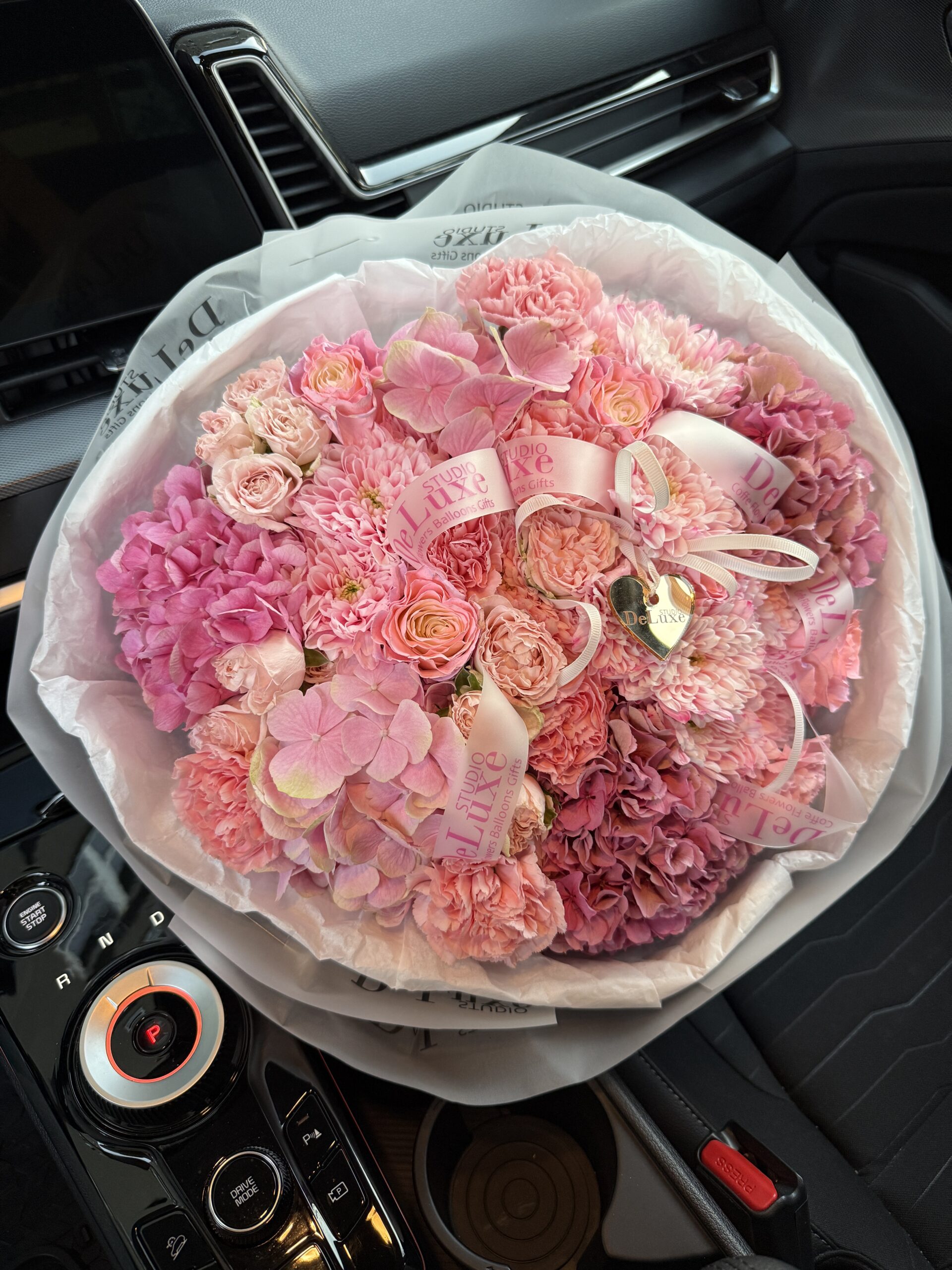 Ten wyjątkowy bukiet z hortensji, chryzantem i róż gałązkowych to połączenie klasy, subtelności i romantycznego uroku. Delikatne odcienie różu, beżu i kremu tworzą harmonijną, pastelową całość, która zachwyca swoją miękkością i lekkością. To idealna propozycja dla miłośników eleganckich, kobiecych bukietów – doskonała na rocznicę, urodziny, Dzień Matki czy ślub. Każdy detal kompozycji został zaprojektowany z myślą o pięknie i emocjach.