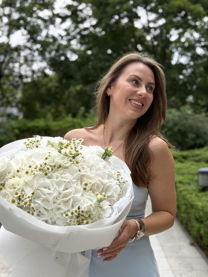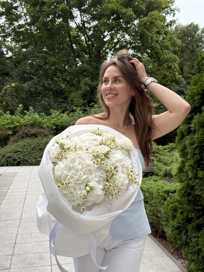 Wyjątkowa kompozycja, która łączy elegancję, świeżość i subtelny urok. Bukiet składa się z hortensji, tanacetuma i eustomy, tworząc harmonijną mieszankę różnych kształtów, kolorów i tekstur. Każdy kwiat wnosi do bukietu wyjątkowy charakter – hortensje dodają objętości, tanacetum świeżości, a eustoma delikatności i romantyzmu.