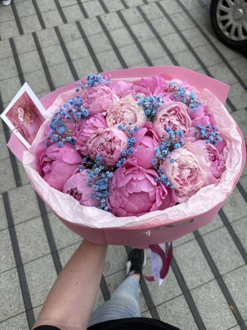 Bukiet z piwonii i gipsówki to połączenie majestatycznych, okazałych kwiatów piwonii z delikatnymi, drobnymi kwiatami gipsówki, które tworzą efekt „mgiełki” wokół głównych kwiatów, dodając kompozycji lekkości, romantyzmu i świeżości. Piwonie, „królowe kwiatów”, charakteryzują się dużymi, często pełnymi płatkami i szeroką gamą kolorów, podczas gdy gipsówka to roślina o licznych drobnych, białych lub barwnych kwiatostanach. Takie połączenie jest idealne na szczególne okazje, tworząc elegancką, świeżą i pełną wdzięku całość. W bukiecie 19 piwonii