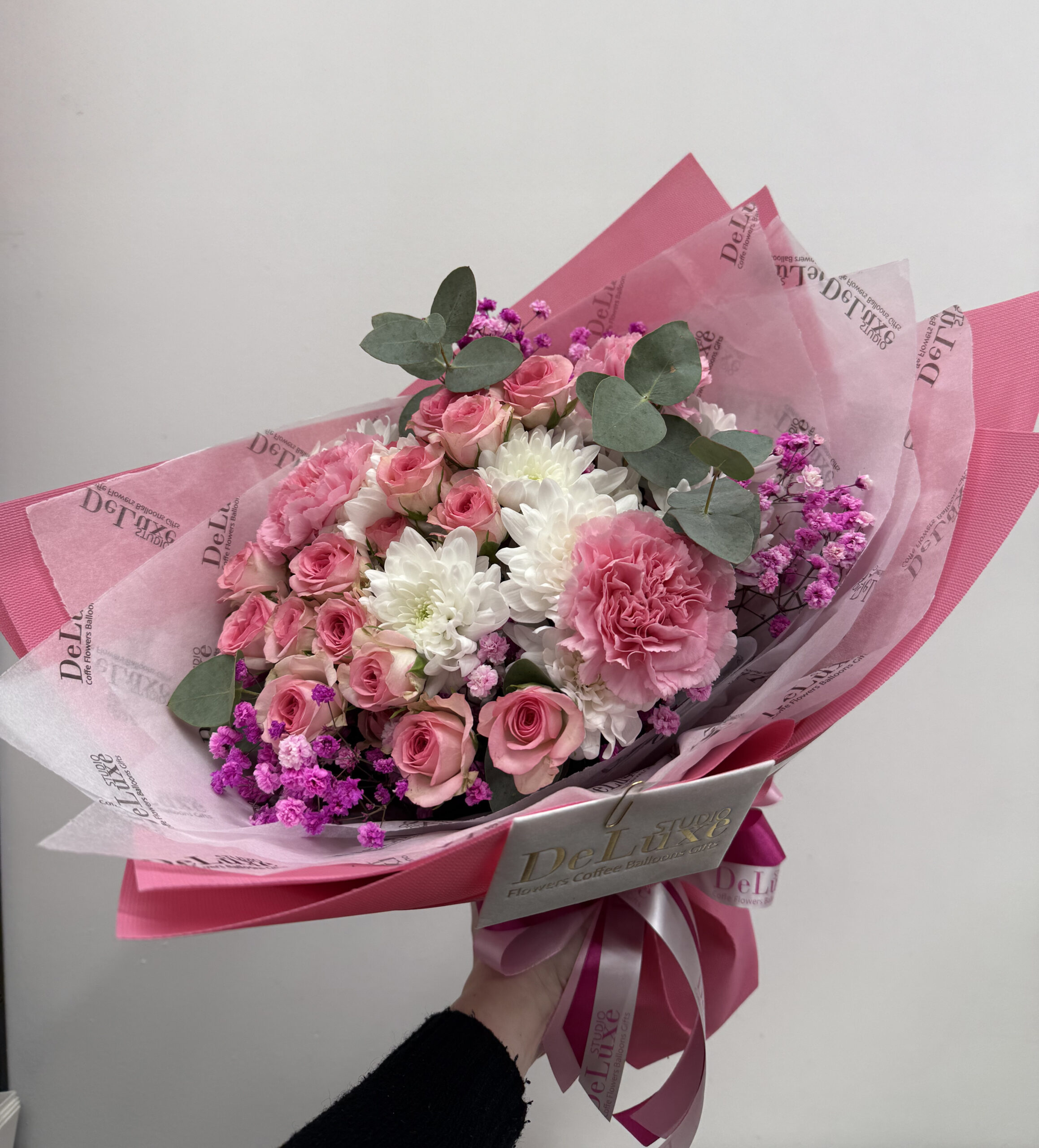 W bukiecie znajdują się różowe róże, białe chryzantemy, goździki oraz dekoracyjny eukaliptus, który nadaje całości świeżości i nowoczesnego charakteru. Uzupełnieniem są drobne akcenty kwiatowe podkreślające lekki, romantyczny styl kompozycji.