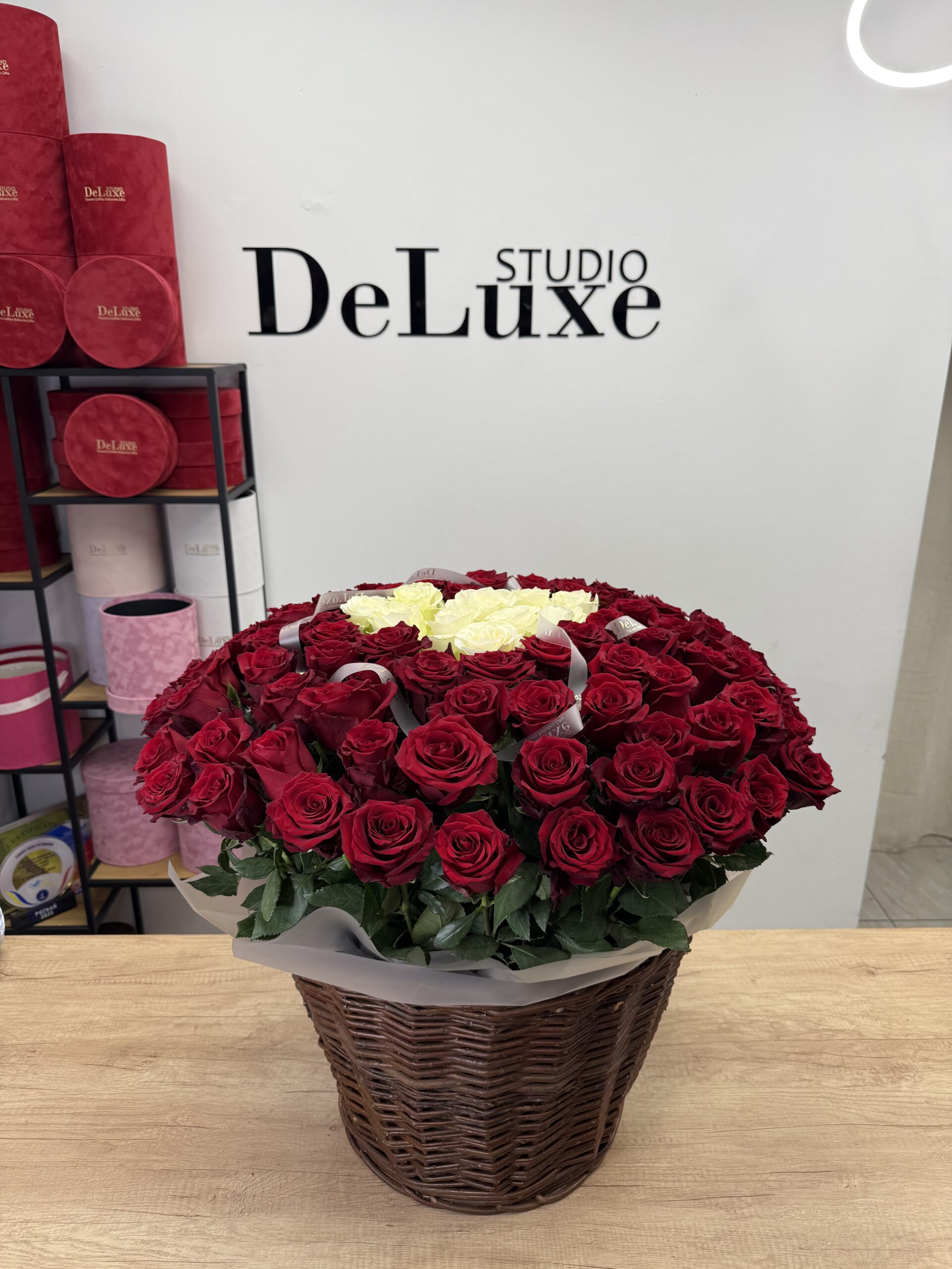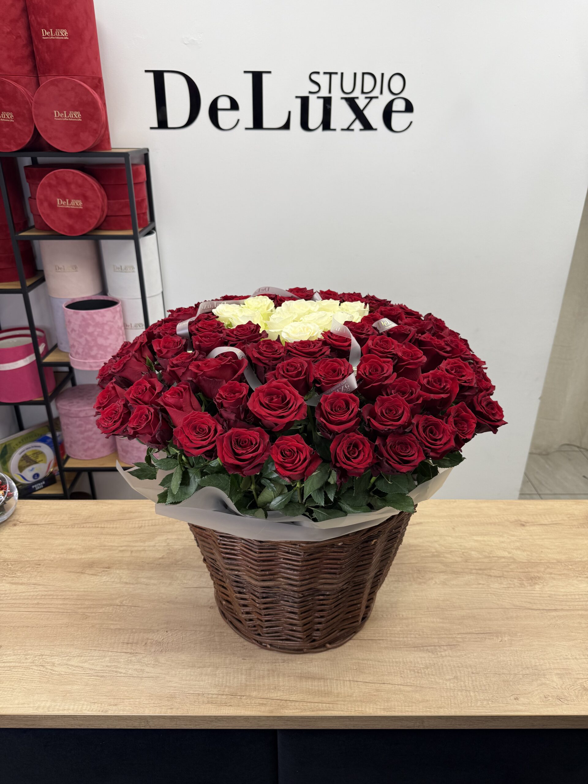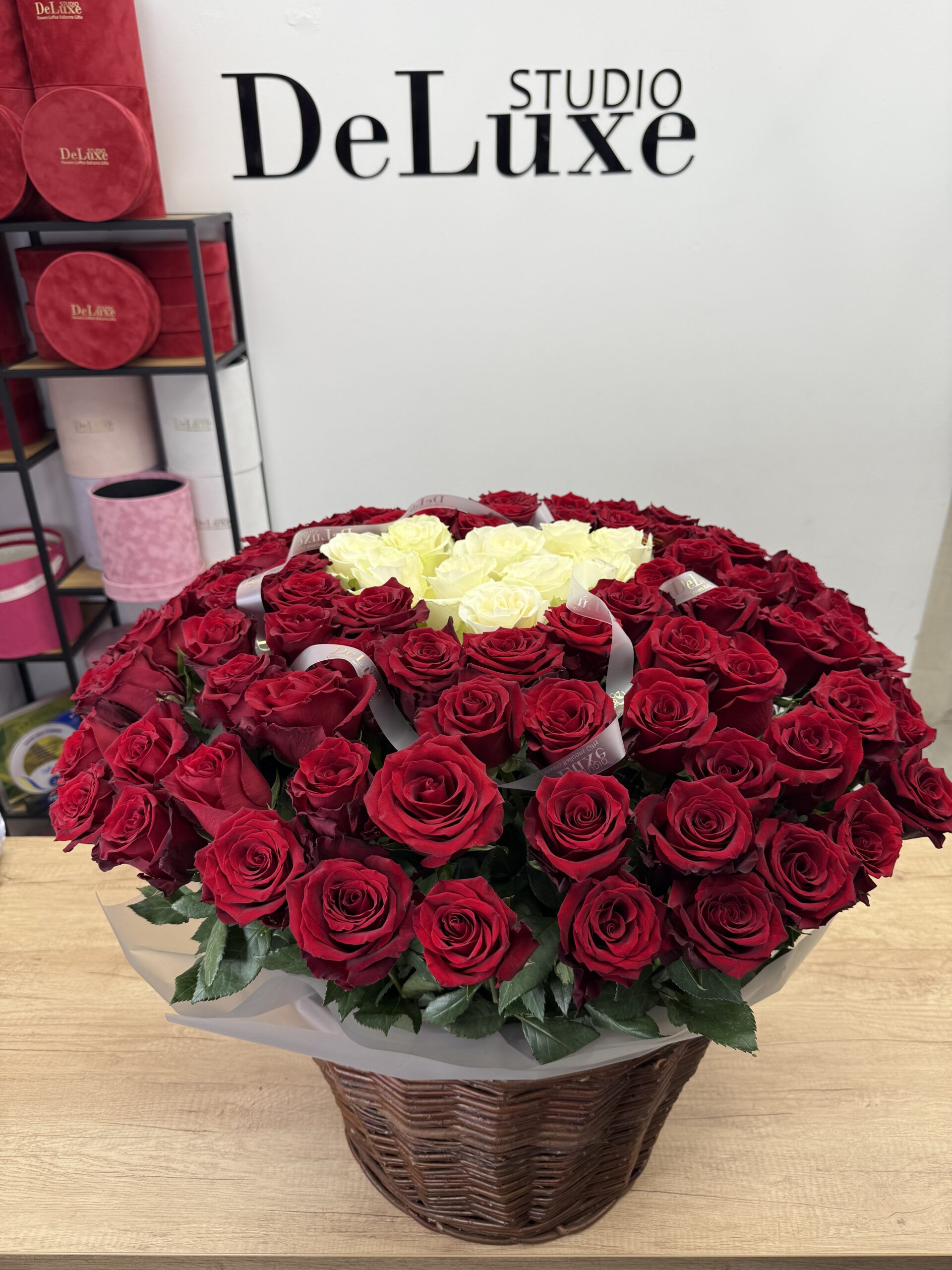101 czerwonych róż w koszu z sercem ułożonym z białych róż.