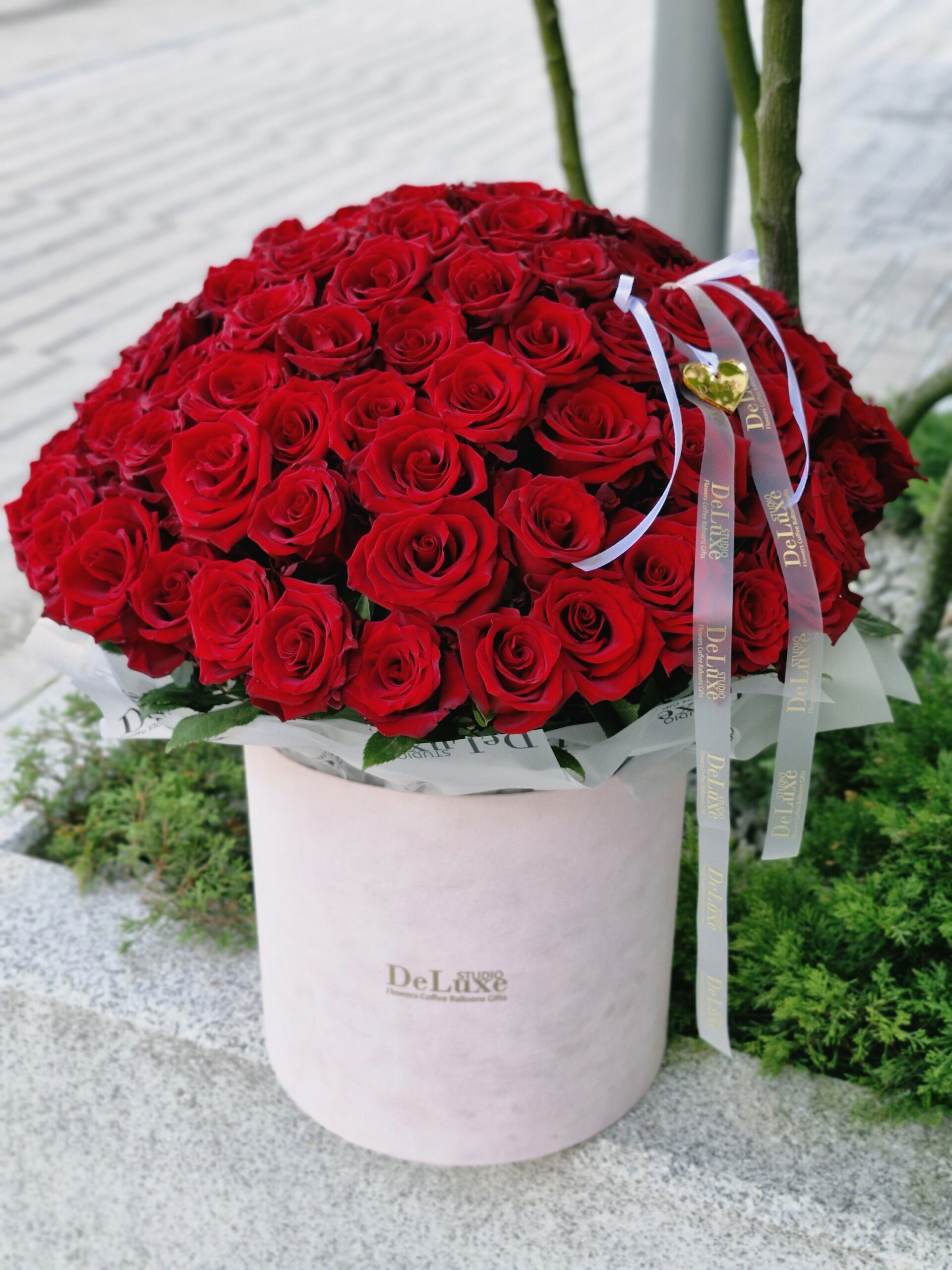 101 róża w pudełku to elegancka kompozycja czerwonych róż – symbol miłości, namiętności i luksusu. Zamów w Studio Deluxe Poznań.