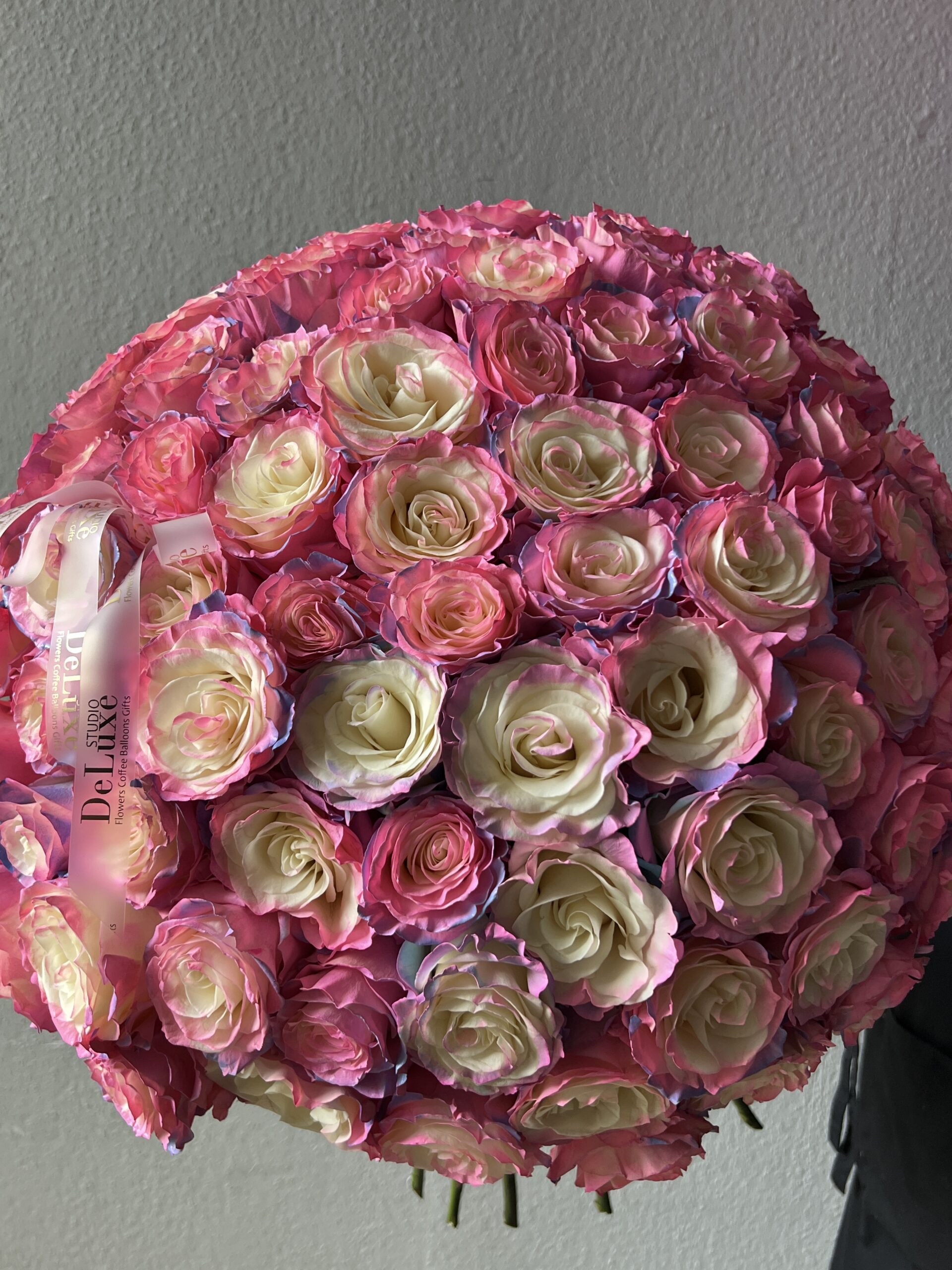 Kolorystyka róż dobierana jest w zależności od aktualnej dostępności, z zachowaniem spójnej, eleganckiej palety barw. Każdy bukiet przygotowywany jest indywidualnie w pracowni Studio Deluxe.