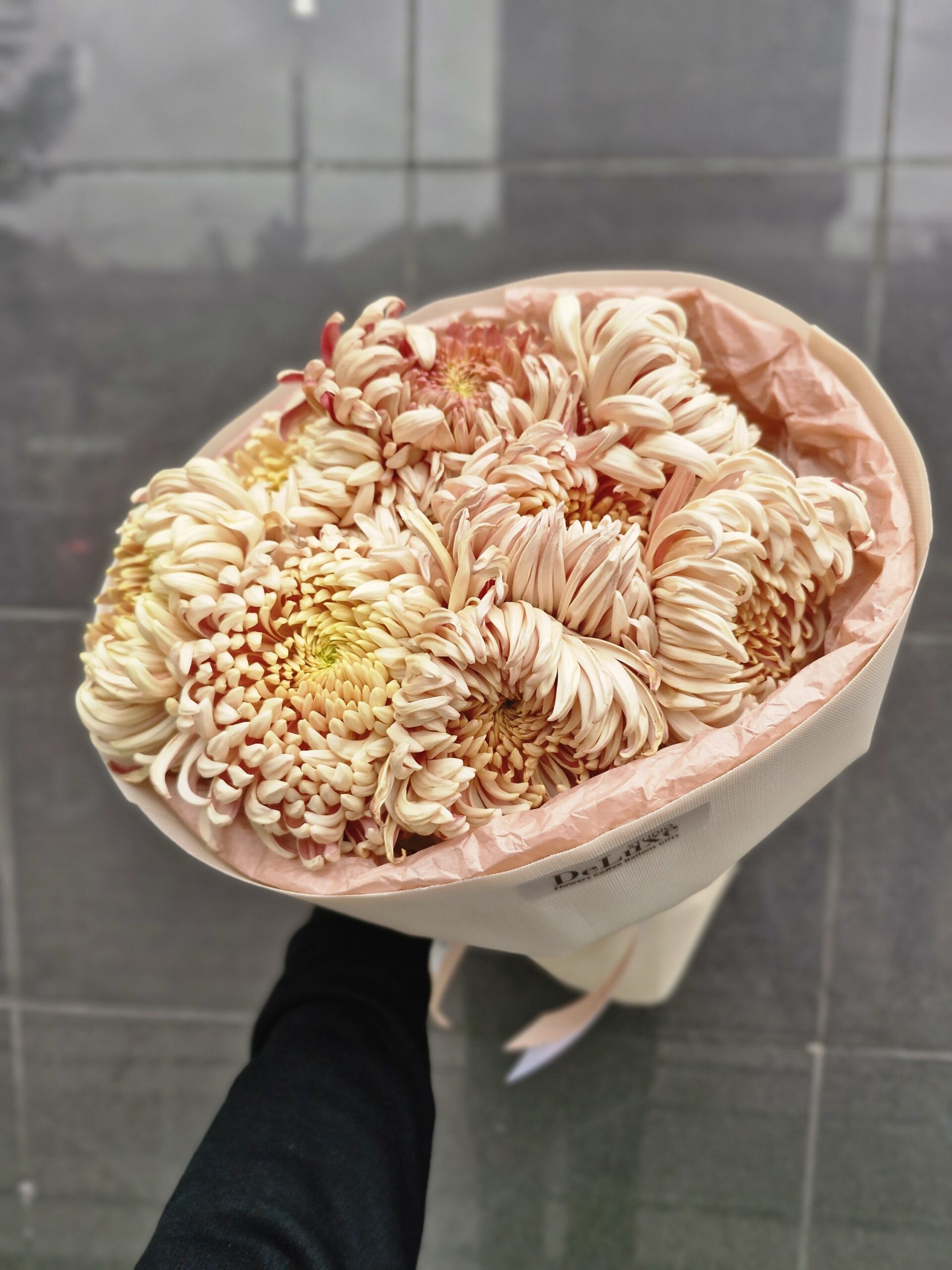 Kwiaty o pełnych, puszystych główkach zachwycają pastelową kolorystyką – od odcieni kremu, przez róż, aż po subtelny brzoskwiniowy ton. Każda chryzantema została starannie ułożona, tworząc harmonijną i spójną kompozycję.