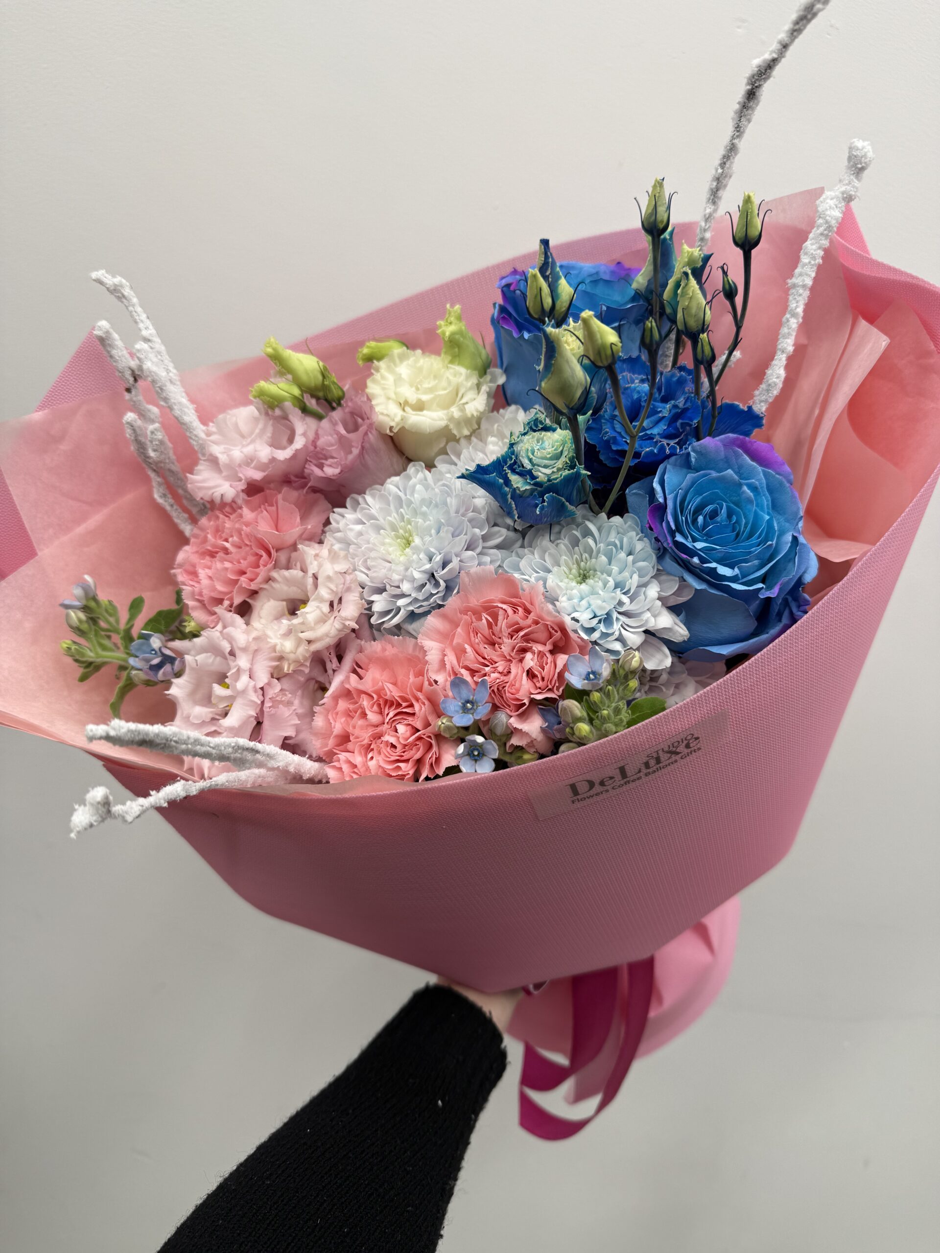 Bukiet zapakowany jest w eleganckie, firmowe opakowanie Studio Deluxe, z dbałością o estetykę oraz świeżość kwiatów.