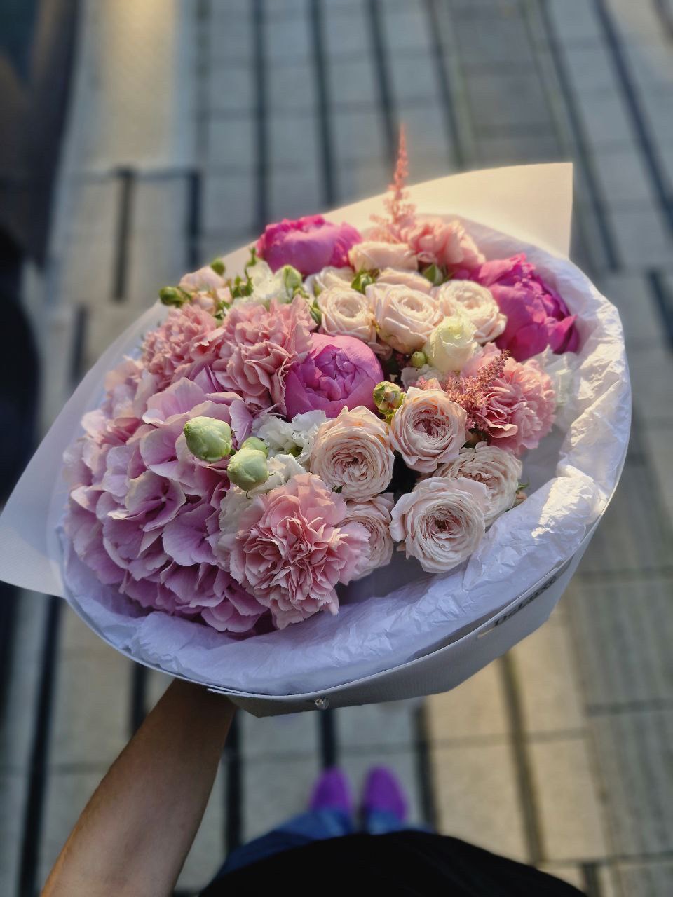 Ten bukiet piwonii, goździków, róż i hortensji to połączenie subtelności i romantycznego uroku. Utrzymany w pastelowej tonacji różu i bieli, emanuje lekkością, wdziękiem i kobiecością. Idealny na wyjątkowe okazje – rocznicę, ślub, Dzień Matki lub prezent „bez okazji”.