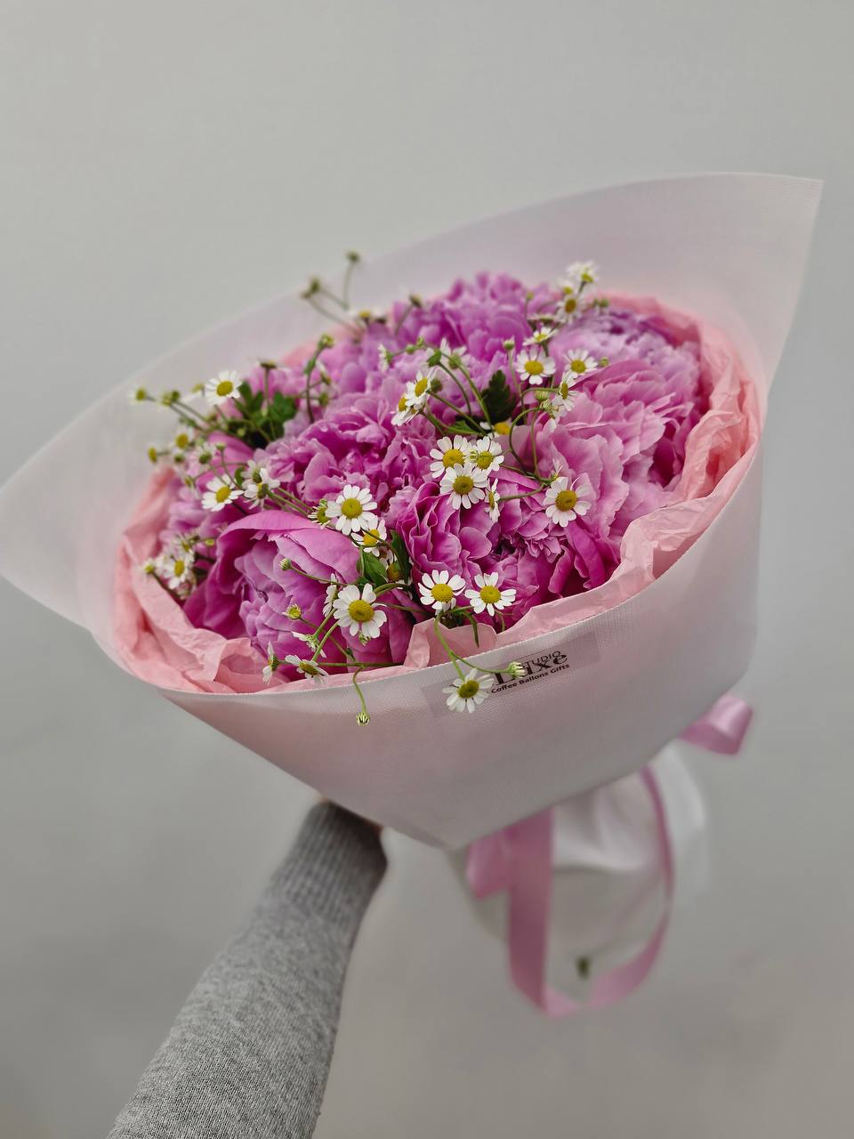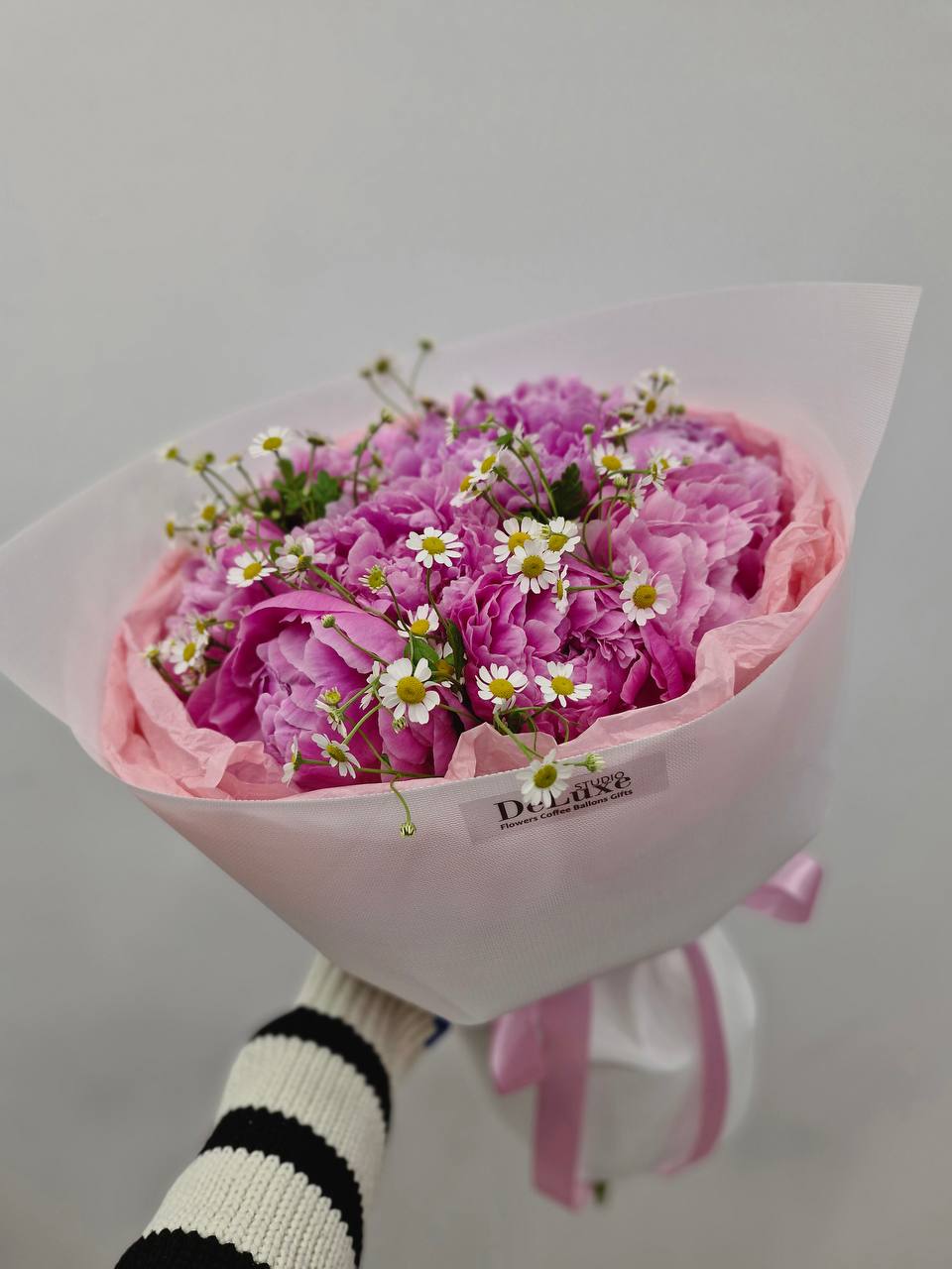 Romantyczny bukiet piwonii z rumiankiem w różowej oprawie florystycznej. Ręcznie wykonana kompozycja Studio Deluxe na wyjątkowe okazje.