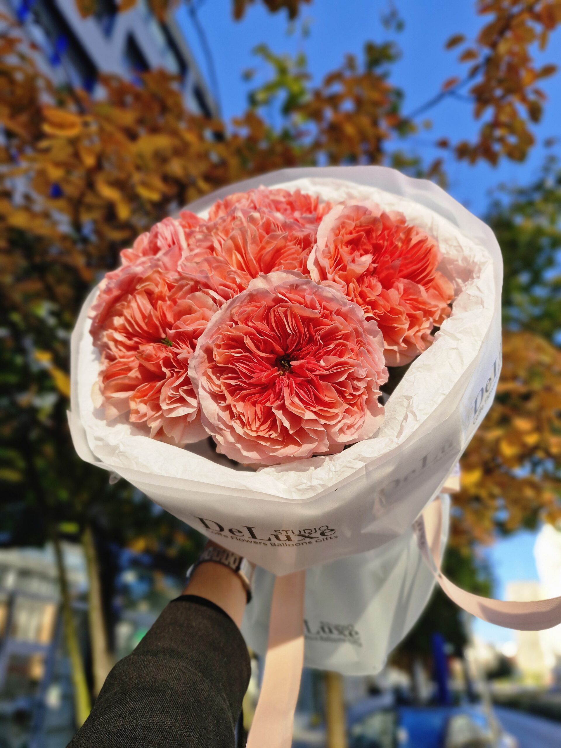 Bukiet róż Candy Expression to elegancka i efektowna kompozycja z siedmiu pioniowych róż o intensywnym, ciepłym odcieniu różu i koralu.