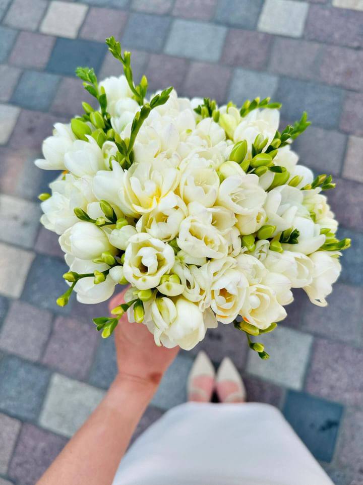 Bukiet ślubny to elegancka i niezwykle subtelna kompozycja, która zachwyca swoją lekkością oraz naturalnym urokiem. Śnieżnobiałe frezje tworzą harmonijną, delikatną formę, idealnie wpisującą się w romantyczny charakter ceremonii ślubnej. Bukiet ślubny z frezji białej składa się wyłącznie z frezji, dzięki czemu zachowuje minimalistyczny i ponadczasowy styl. Jeśli szukasz więcej inspiracji, sprawdź nasze monobukiety oraz eleganckie bukiety mieszane. Frezja symbolizuje niewinność, czystość oraz zaufanie, dlatego bukiet ślubny z frezji białej jest jednym z najczęściej wybieranych rozwiązań przez panny młode. Jej delikatny, przyjemny zapach dodatkowo podkreśla wyjątkowość chwili. Bukiet  z frezji białej doskonale komponuje się z klasyczną suknią ślubną, stylizacjami w stylu boho, a także nowoczesnymi, minimalistycznymi aranżacjami. To idealny wybór na ślub, sesję zdjęciową oraz eleganckie przyjęcia. Każdy bukiet przygotowywany jest indywidualnie z najświeższych kwiatów, dlatego może się nieznacznie różnić, zachowując jednak swój charakter i formę. Do bukietu możesz dobrać dodatki, takie jak balony, słodycze lub pluszaki, aby stworzyć wyjątkowy zestaw. Zobacz więcej realizacji: @studiodeluxe_pl Na zdjęciu bukiet ślubny z białej frezji w formie okrągłej kompozycji.
