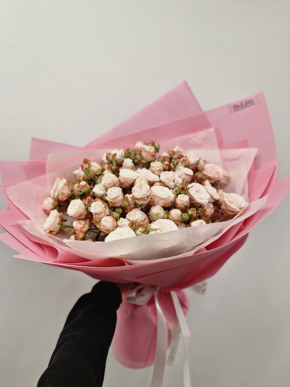 Bukiet z 15 gałązkowych róż Bombastik w pastelowych odcieniach różu i brzoskwini. Romantyczny prezent z dostawą w Poznaniu – Studio Deluxe.