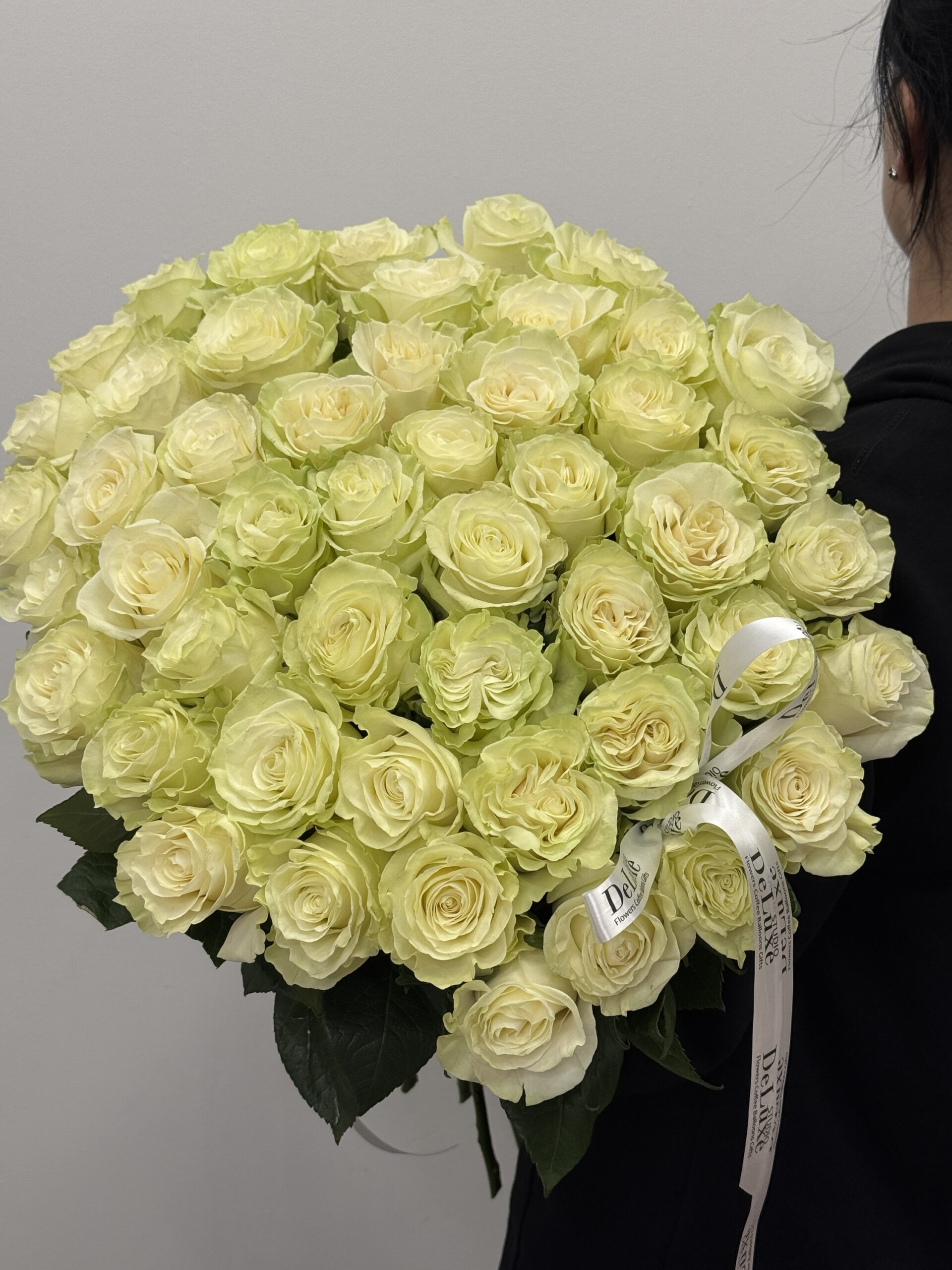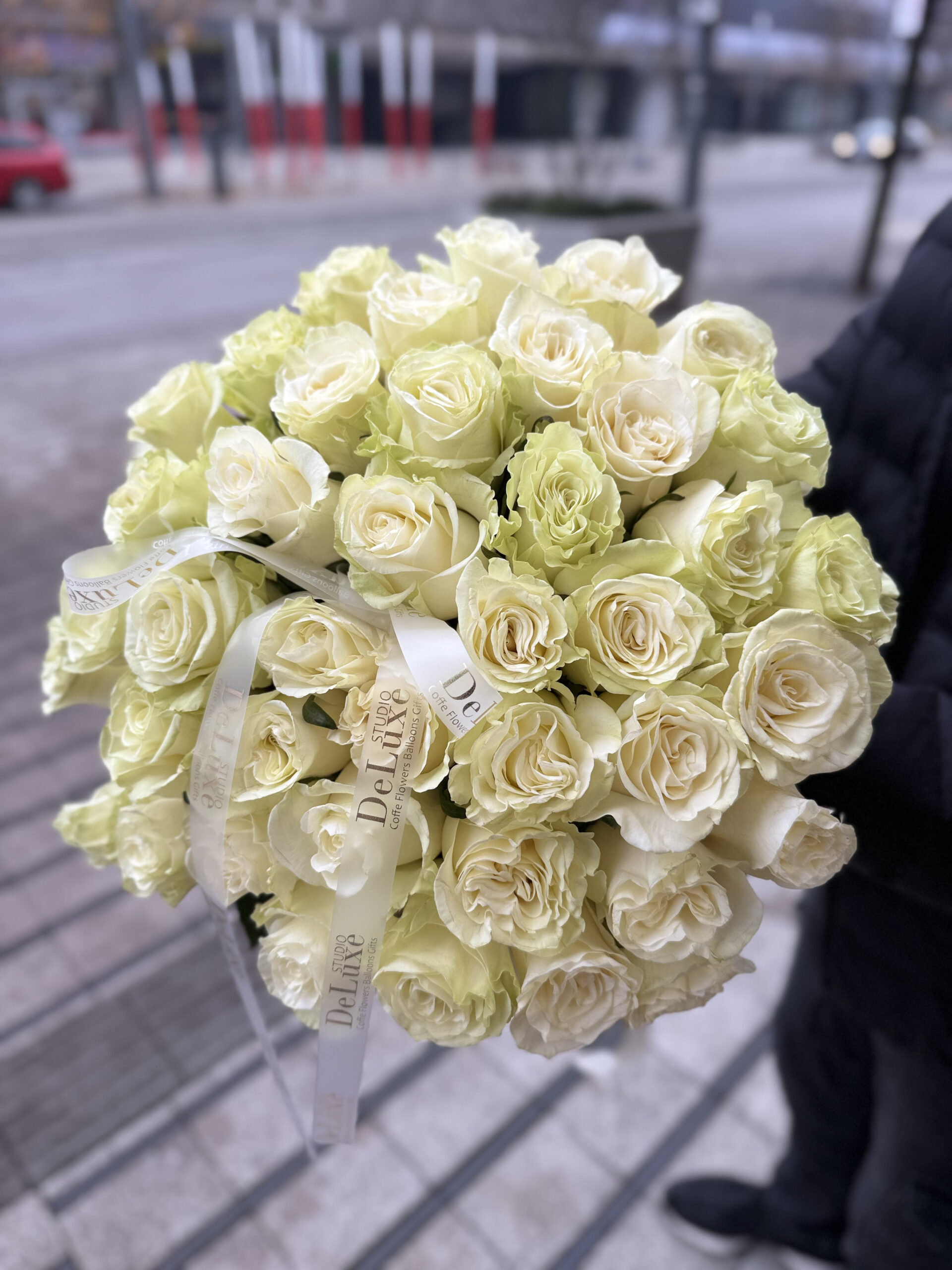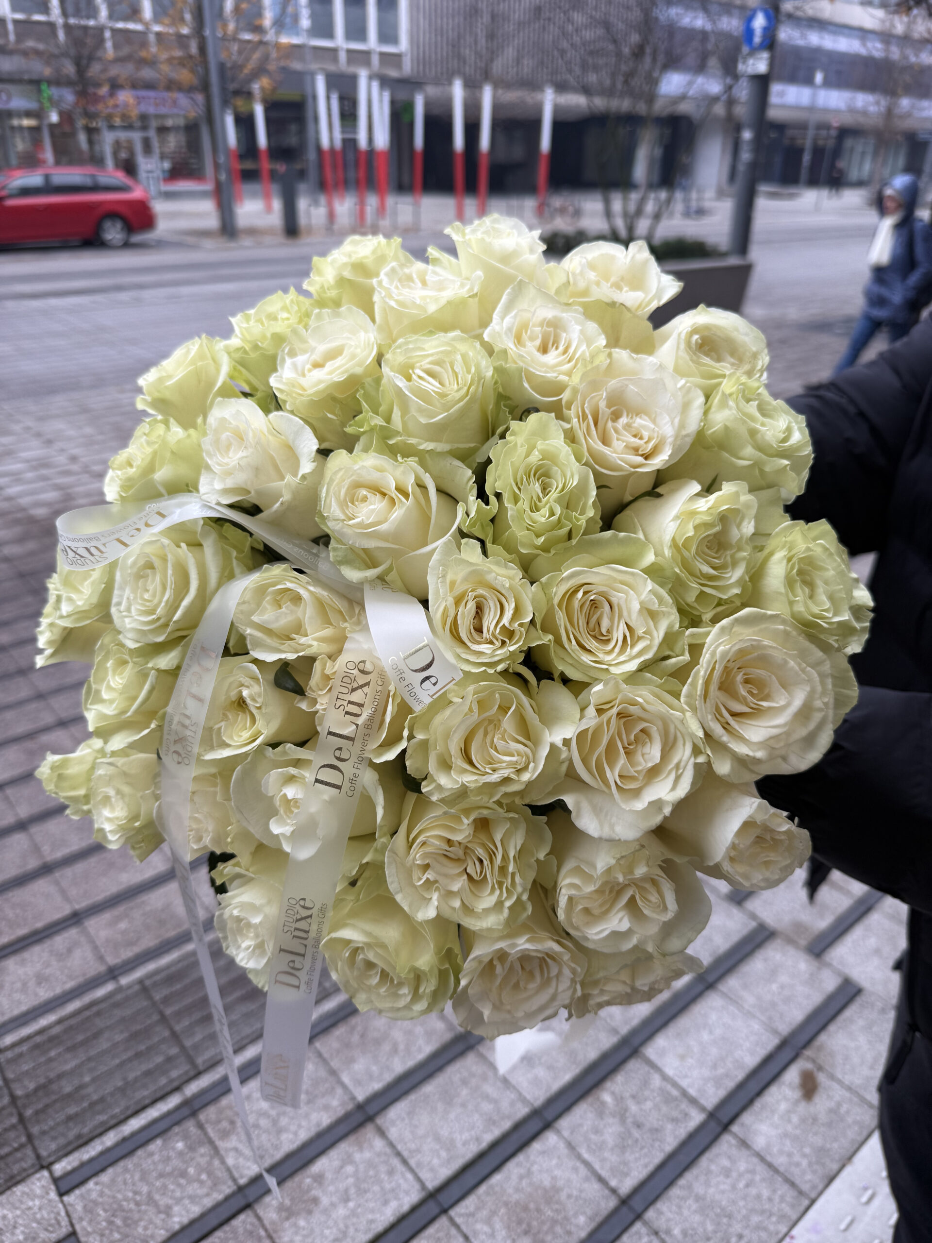 Ekskluzywny bukiet z 51 białych róż Mondial o dużych, eleganckich pąkach. Idealny na ślub, rocznicę, zaręczyny lub jako wyjątkowy prezent pełen klasy. Kompozycja jest starannie ułożona i przewiązana firmową wstążką Studio Deluxe, gotowa do wręczenia.