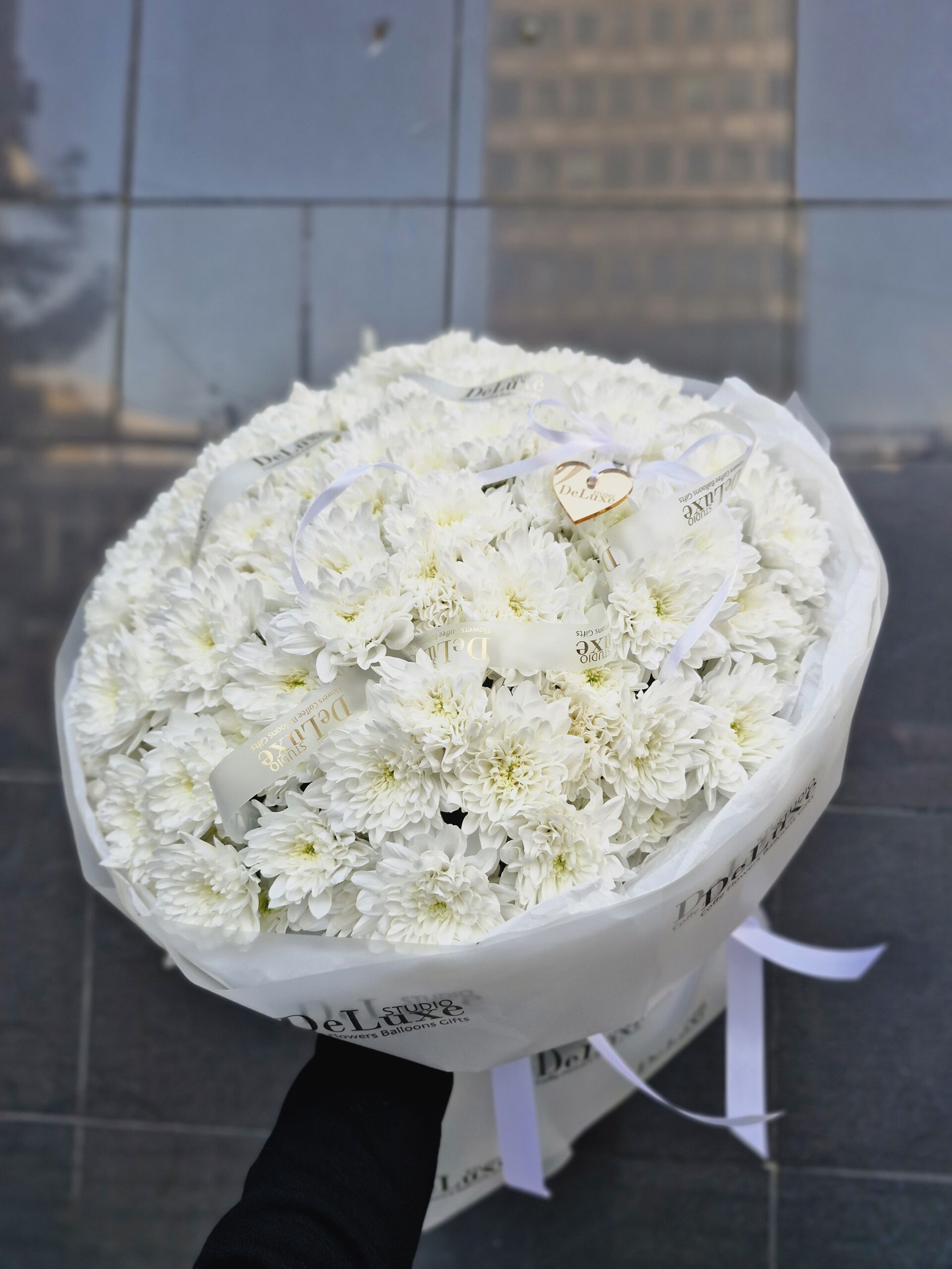 Ten wyjątkowy bukiet z chryzantemy (25 szt) zachwyca prostotą, świeżością i ponadczasowym urokiem. Delikatne, śnieżnobiałe kwiaty symbolizują czystość, harmonię i spokój, tworząc lekką, a zarazem elegancką kompozycję.