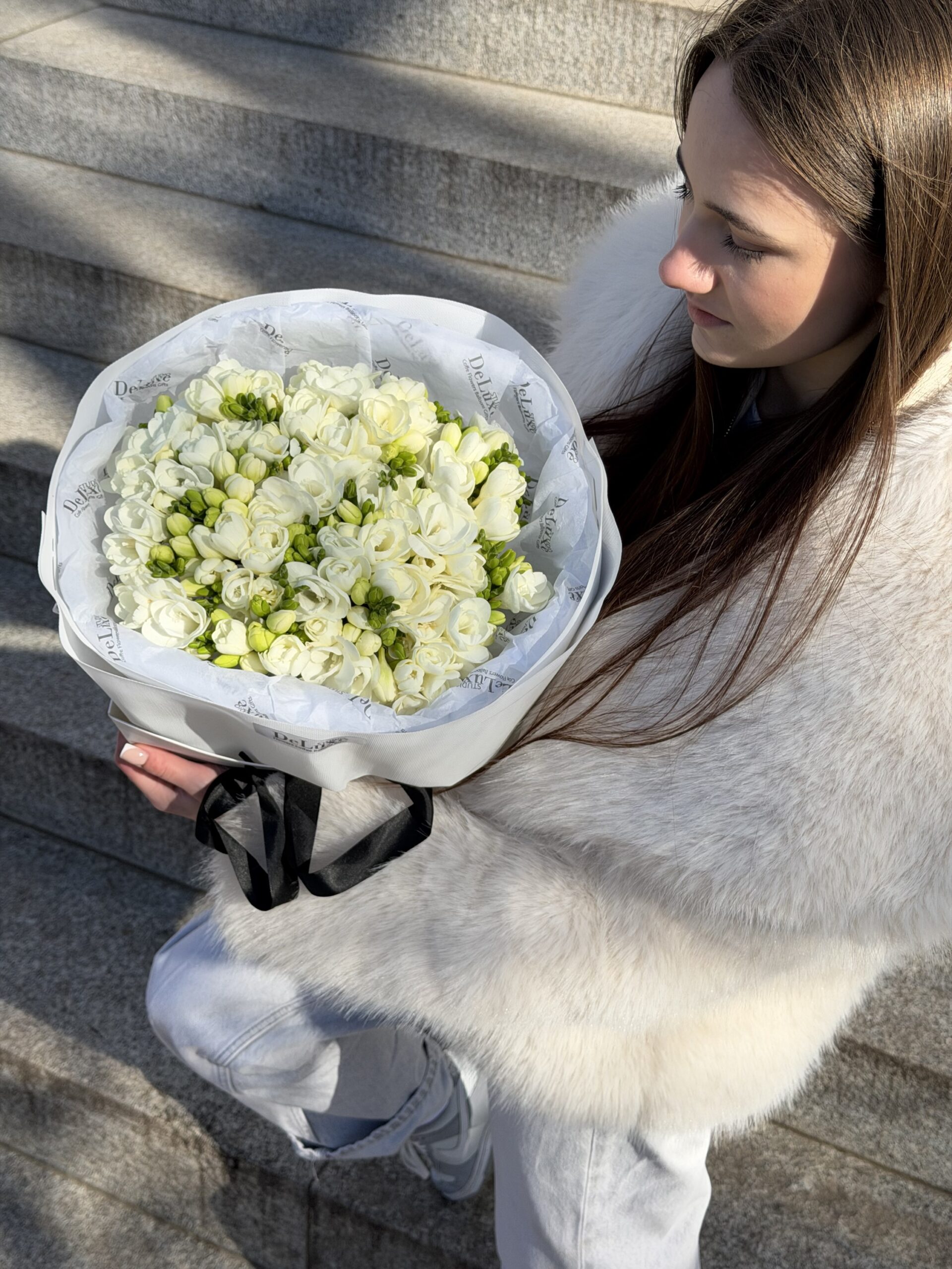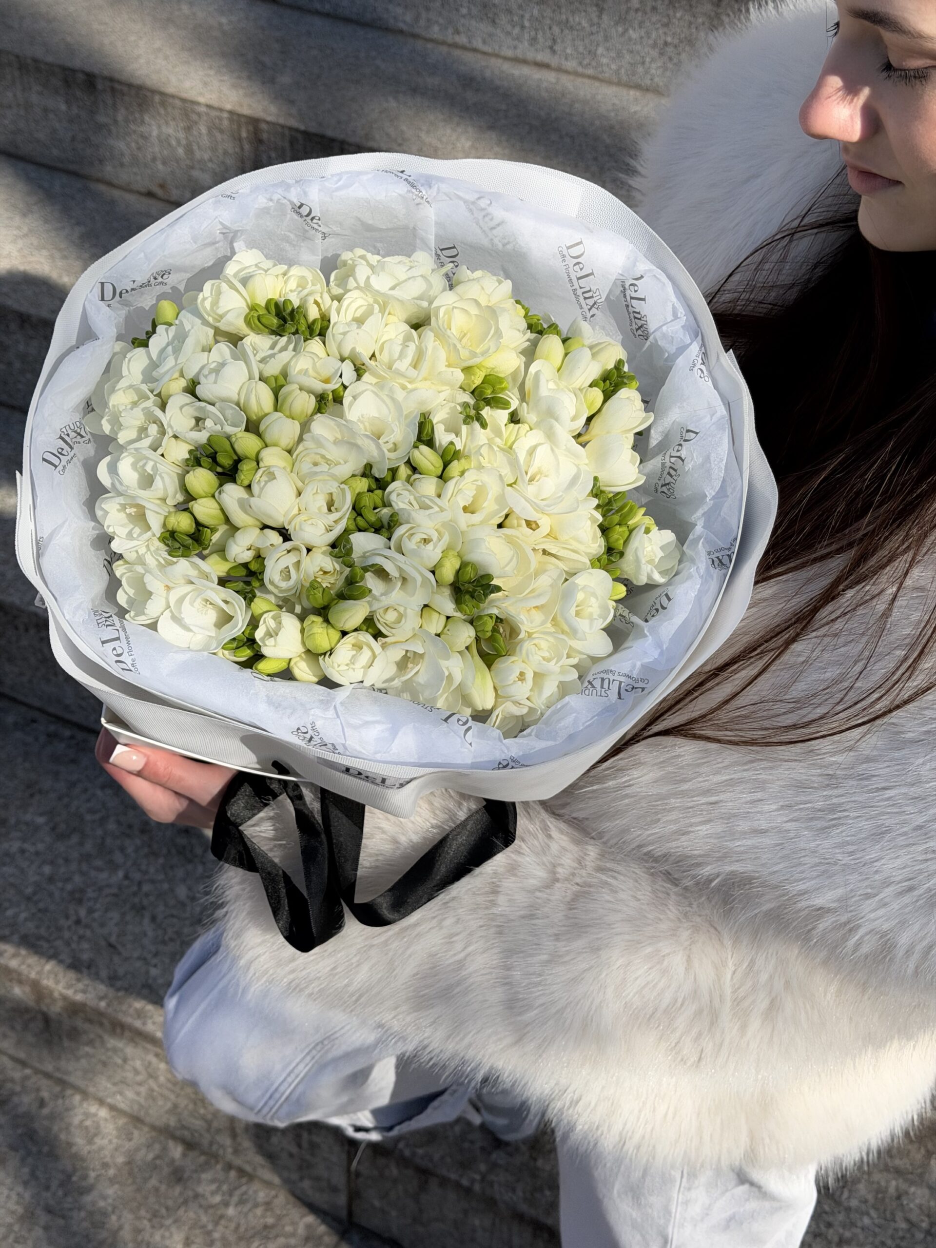 Bukiet z białej frezji – delikatne, pachnące kwiaty w eleganckiej oprawie. Idealny na prezent. Dostawa kwiatów Poznań – zamów online.