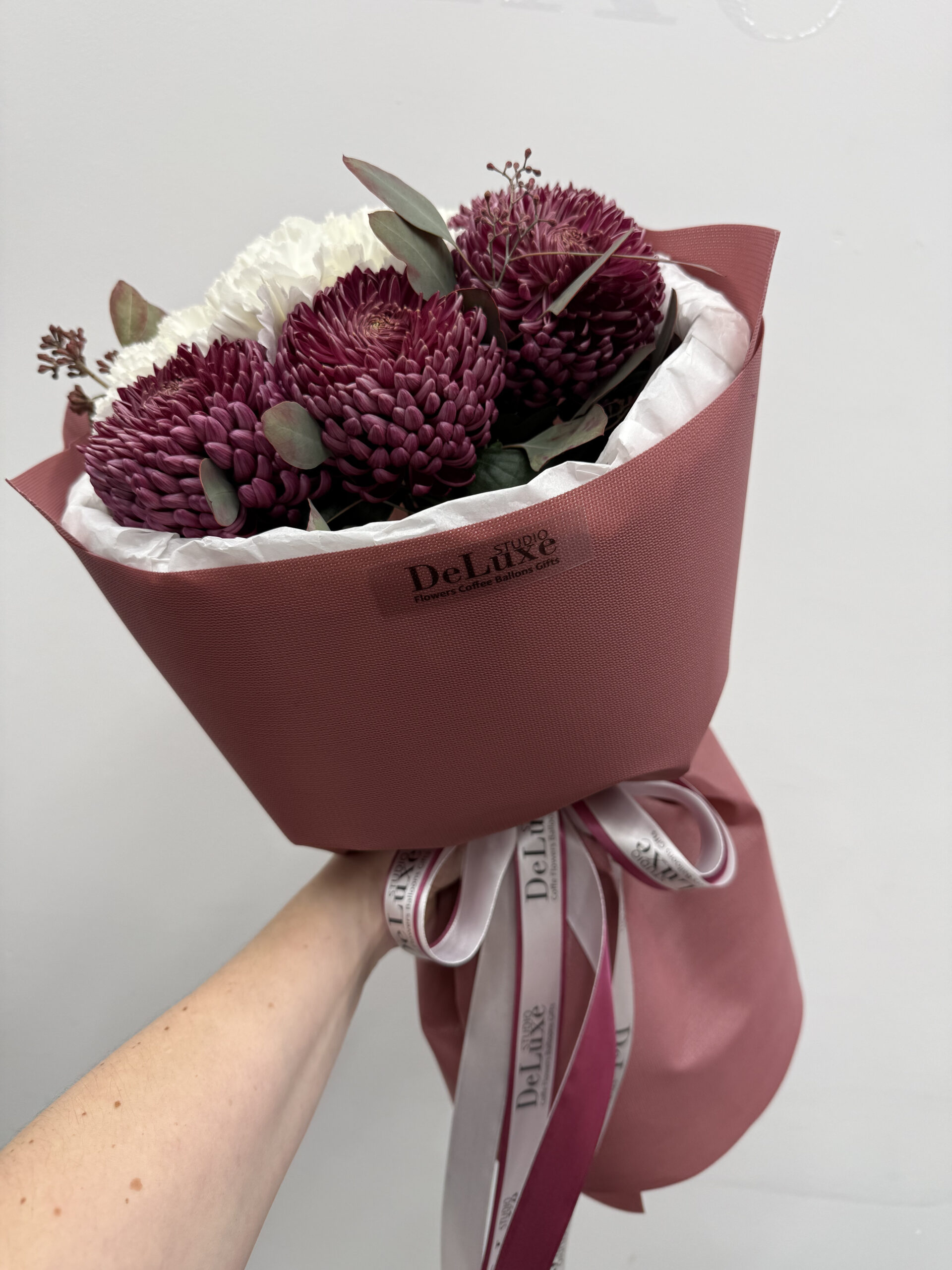 Na zdjęciu bukiet z bordowych chryzantem i białych goździków – elegancka, intensywna kompozycja wykonana w charakterystycznym stylu Studio Deluxe.