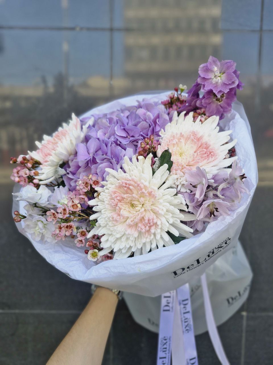 W skład bukietu wchodzą okazałe chryzantemy w biało–różowych tonach, romantyczne hortensje w kolorze lawendowym oraz smukłe, lekkie delphinium, które nadają kompozycji przestrzeni i finezji. Drobne waxflowers subtelnie dopełniają całość, wprowadzając wrażenie lekkości i świeżości.