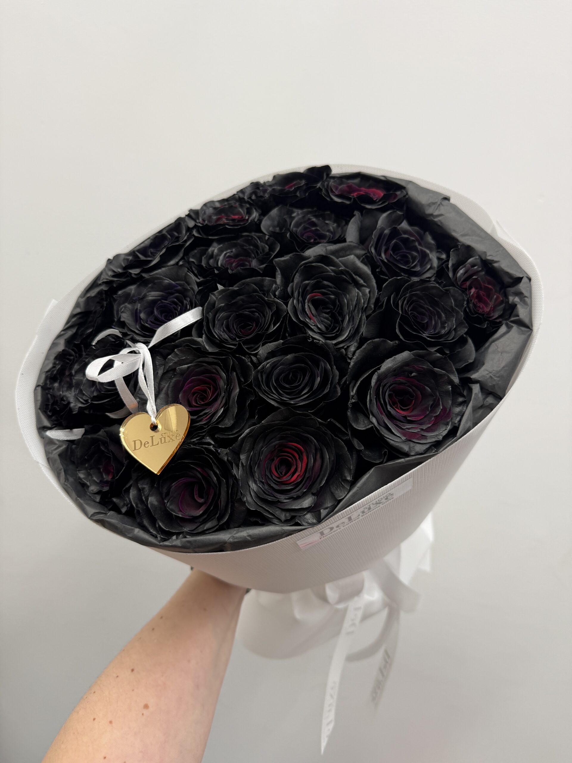 Wymiary bukietu: – Ilość kwiatów: 25 róż – Kolor: głęboka czerń z delikatnym burgundowym tonem płatków