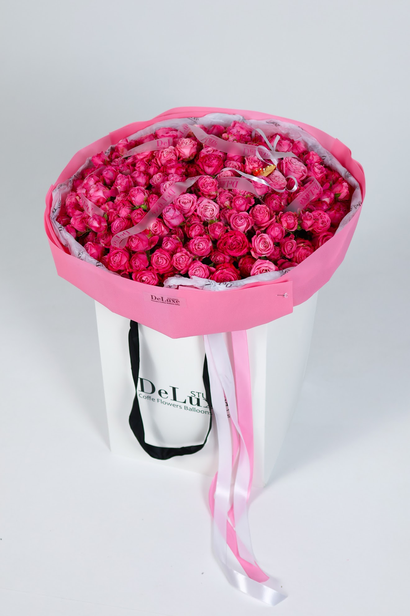 Kompozycja została starannie ułożona i zapakowana w jasne, półtransparentne opakowanie z firmową wstążką Studio Deluxe, co dodatkowo podkreśla ekskluzywny charakter bukietu.