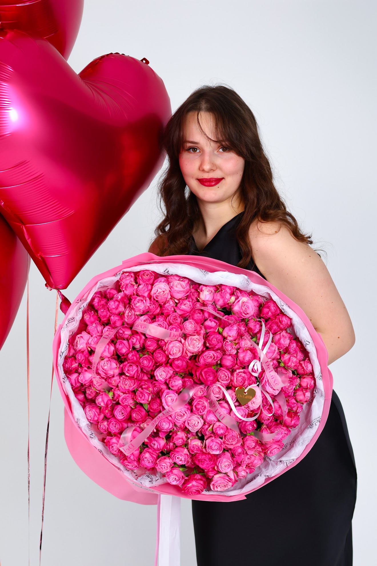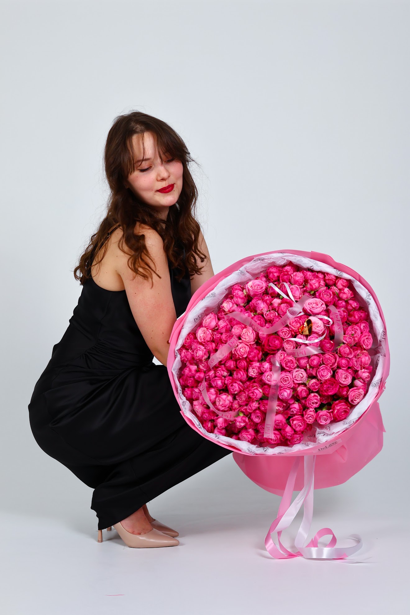 Spektakularny bukiet z gałązkowej róży Madam Bombastik — jednej z najbardziej rozpoznawalnych i cenionych odmian róż spray. Charakterystyczne, drobne pąki tworzą niezwykle gęstą, pełną objętości kompozycję o romantycznym charakterze.