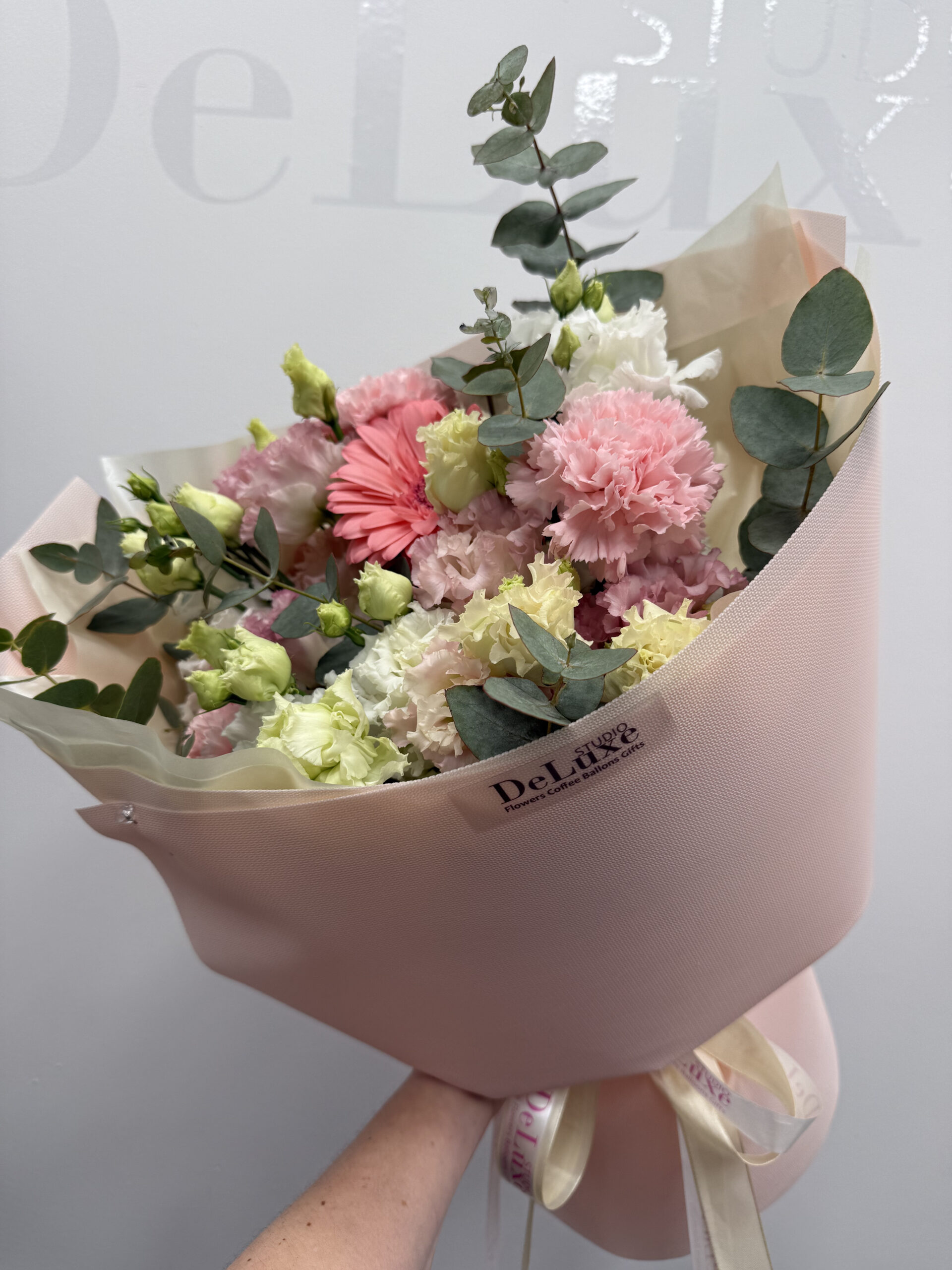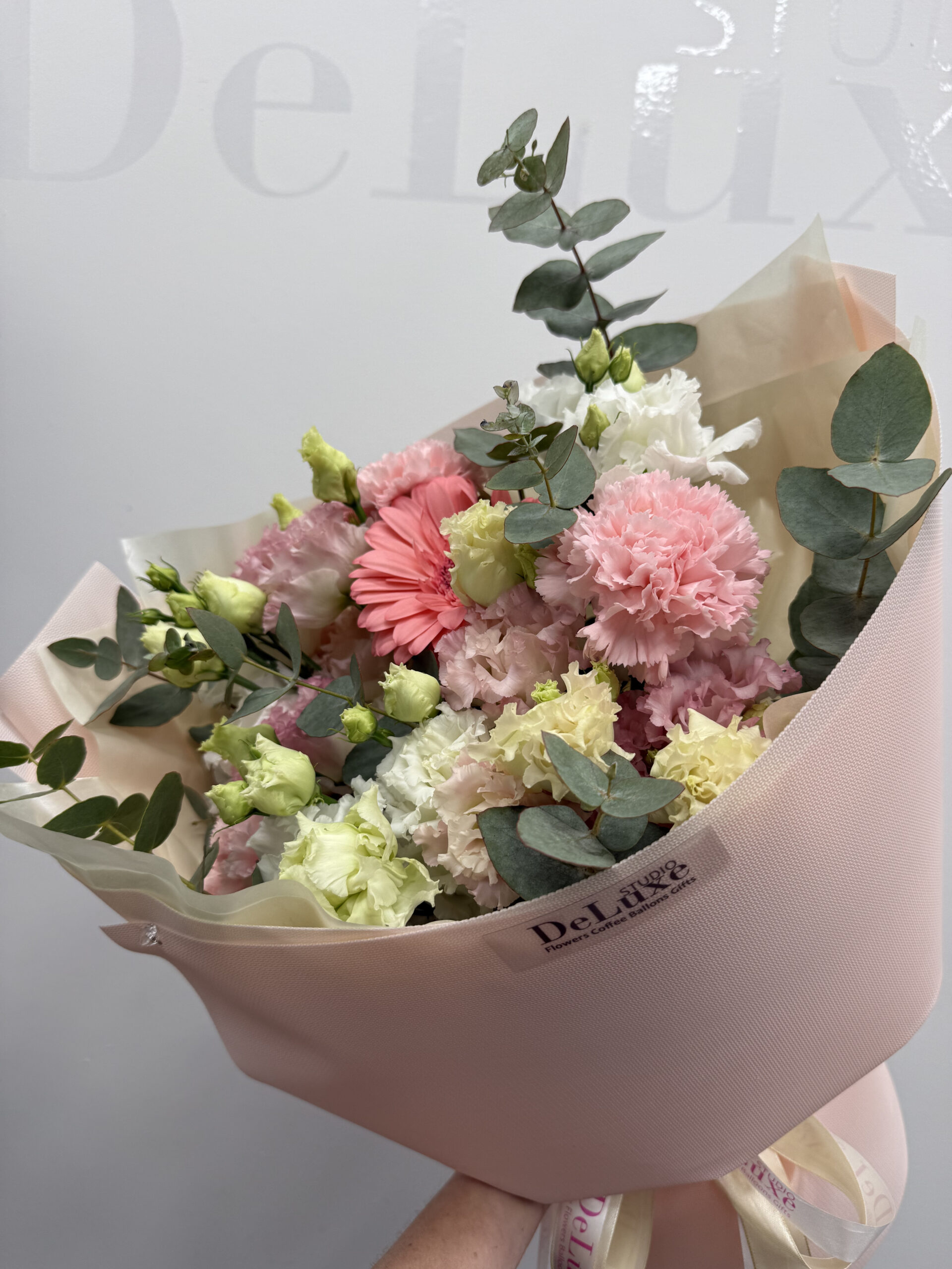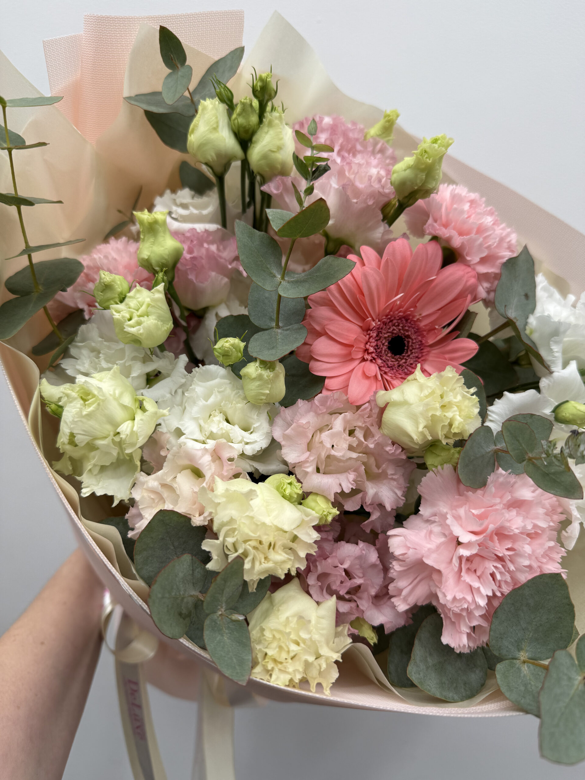 Pastelowe goździki nadają bukietowi miękkości i lekkości, a świeże eustomy w jasnych odcieniach wprowadzają nowoczesną elegancję. Centralny akcent w postaci różowej gerbery dodaje kompozycji jasności, energii i subtelnego uroku, dzięki czemu bukiet prezentuje się niezwykle kobieco i świeżo.