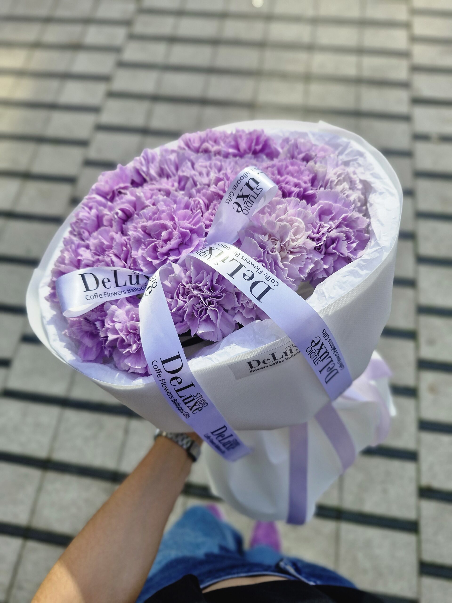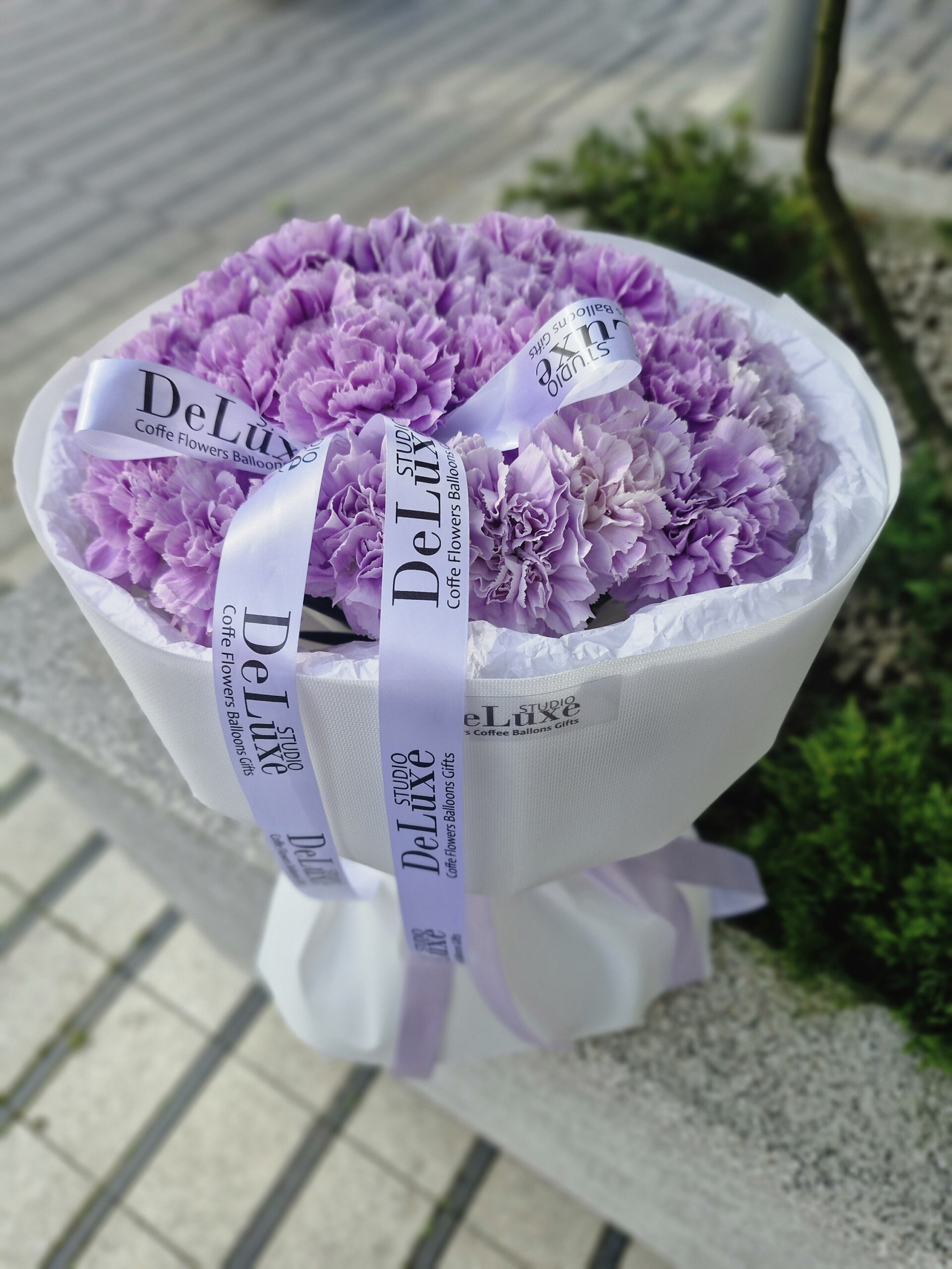 Ten wyjątkowy bukiet z goździków to kompozycja pełna elegancji i delikatności. Kwiaty w odcieniach fioletu – od lawendy po głęboki ametyst – tworzą harmonijną całość, która przyciąga wzrok i nadaje bukietowi nutę tajemniczości.