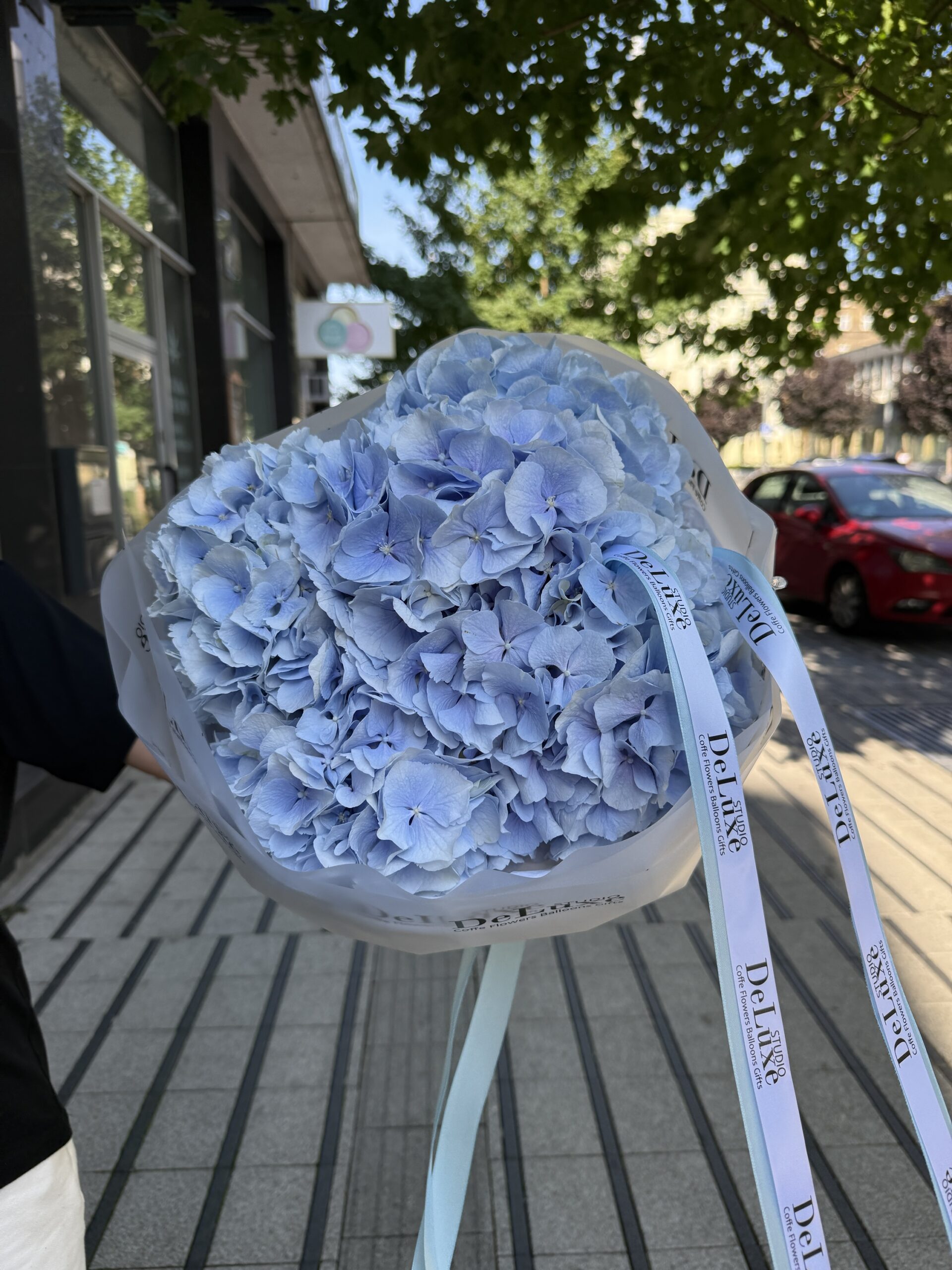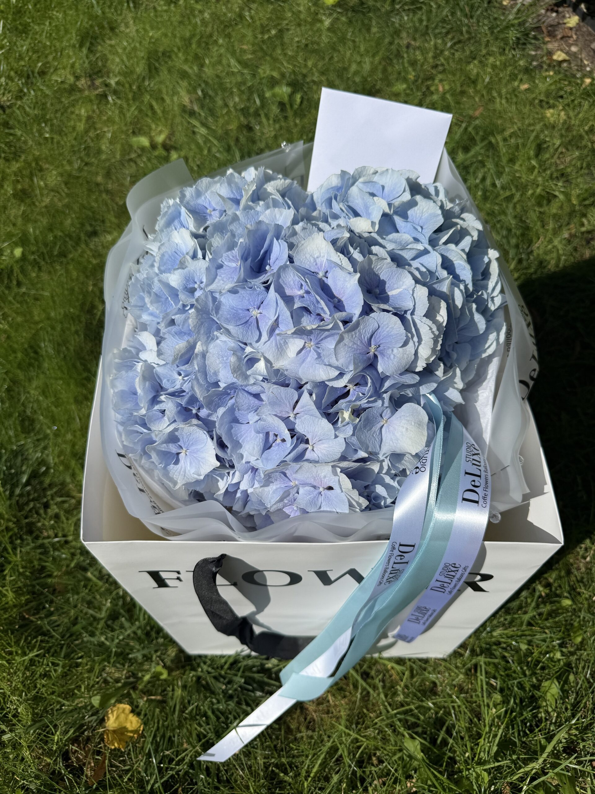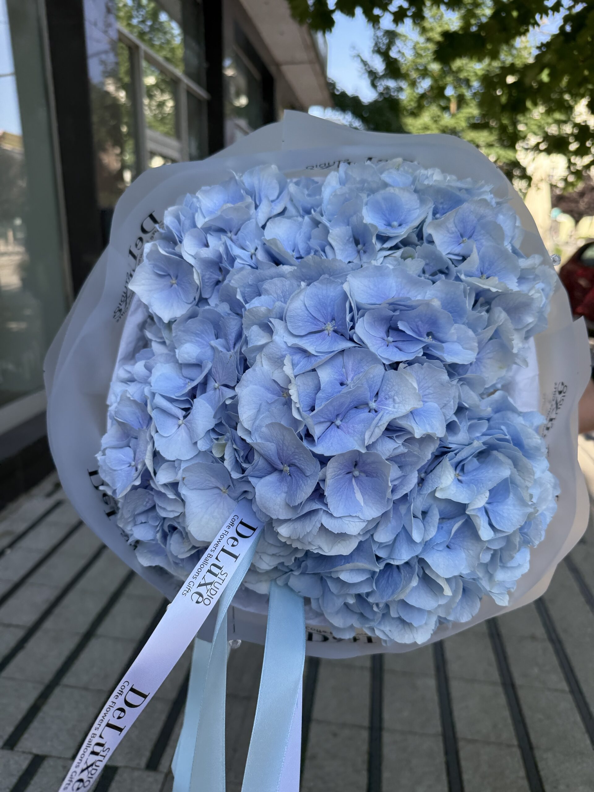 Bukiet z hortensji w niebieskim kolorze to elegancka, świeża kompozycja idealna na prezent lub dekorację. Zamów online w Studio Deluxe Poznań.