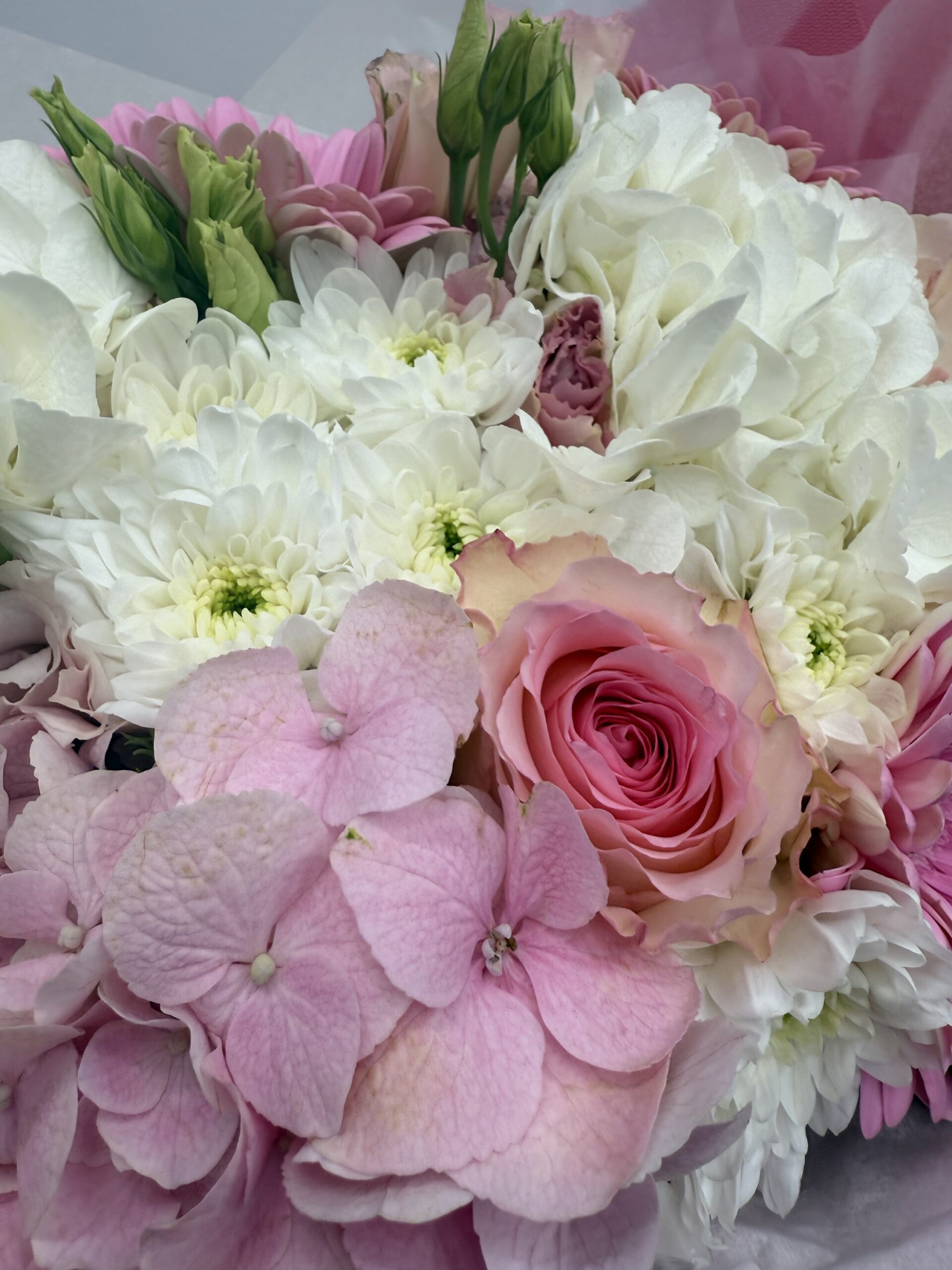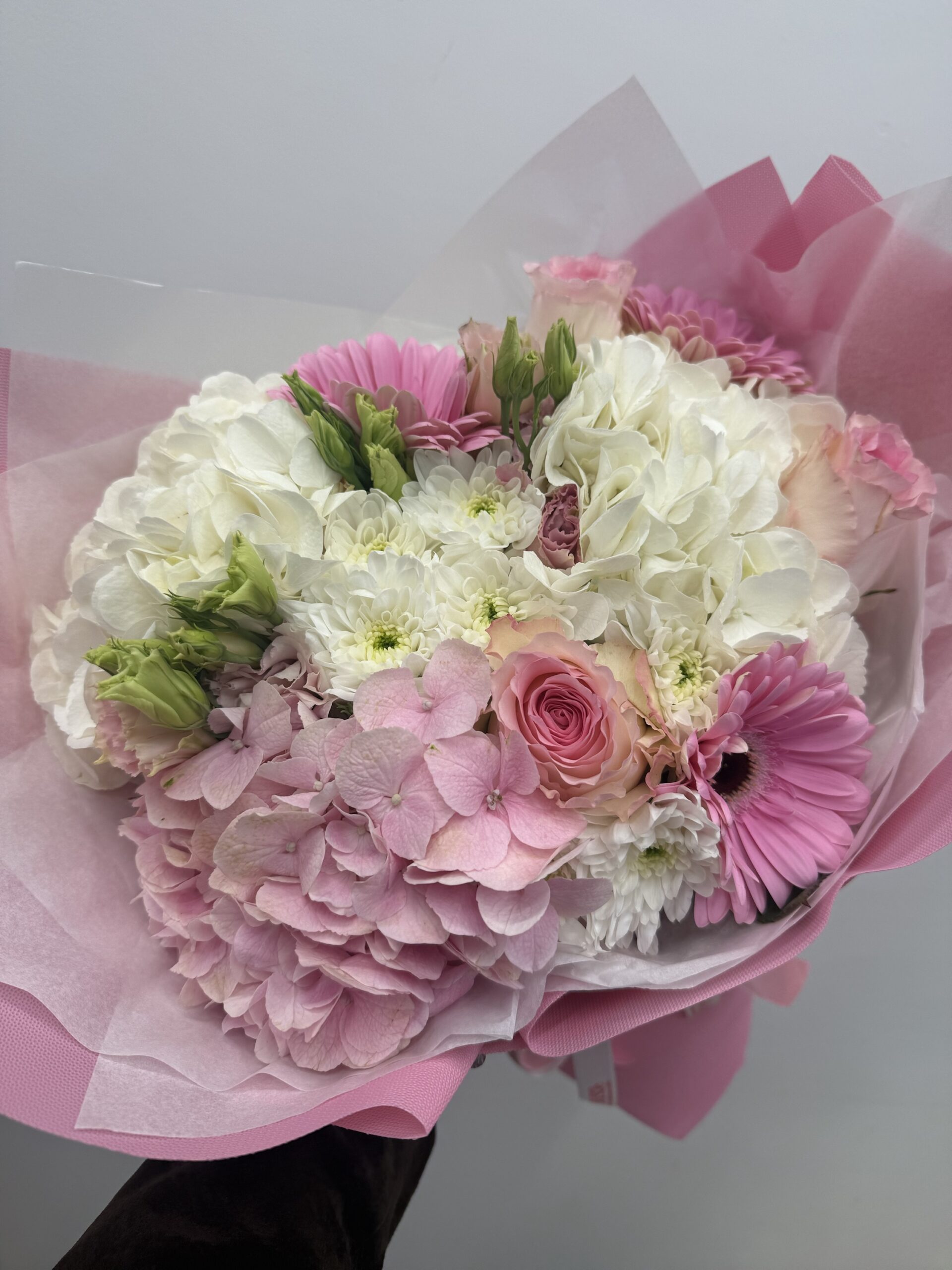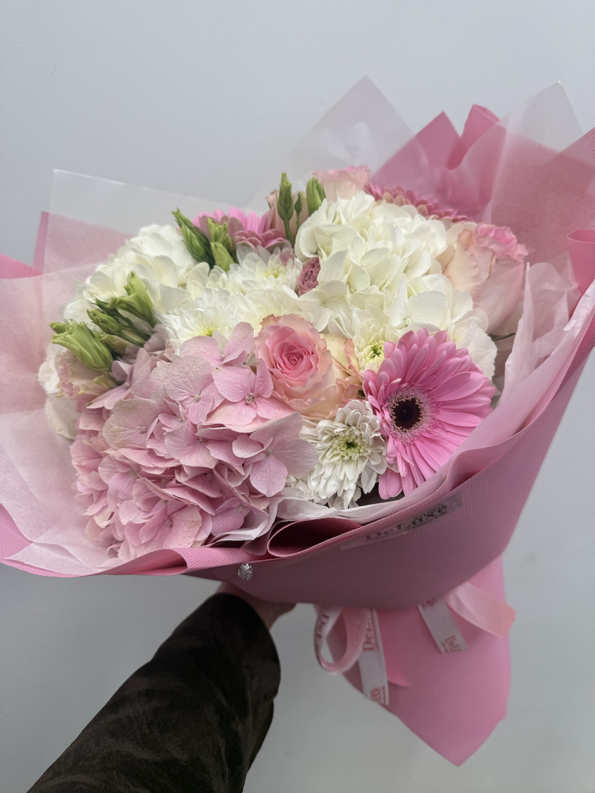 Każdy element został starannie dobrany – biała hortensja nadaje objętości, róże i eustomy dodają elegancji, a różowa gerbera wprowadza świeżość i radość. To bukiet, który zachwyca naturalnym pięknem.