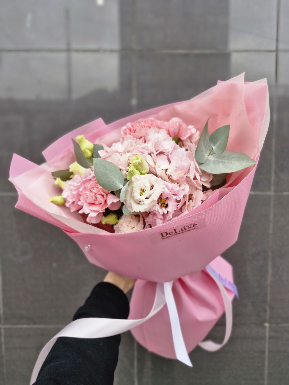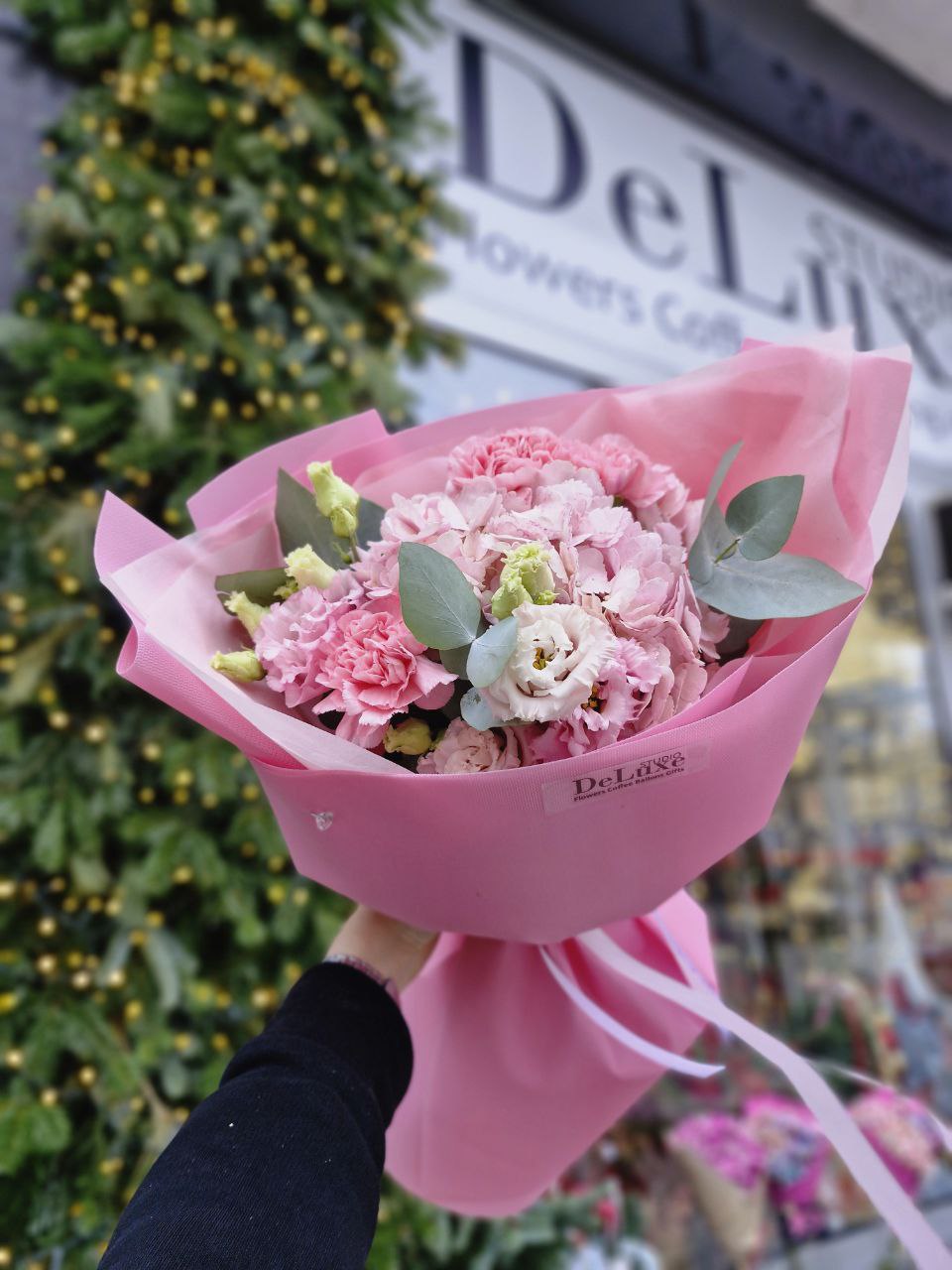 Skład bukietu: – hortensja – goździki – eustoma – eukaliptus – dekoracyjna zieleń – papier florystyczny Studio Deluxe – ozdobna wstążka