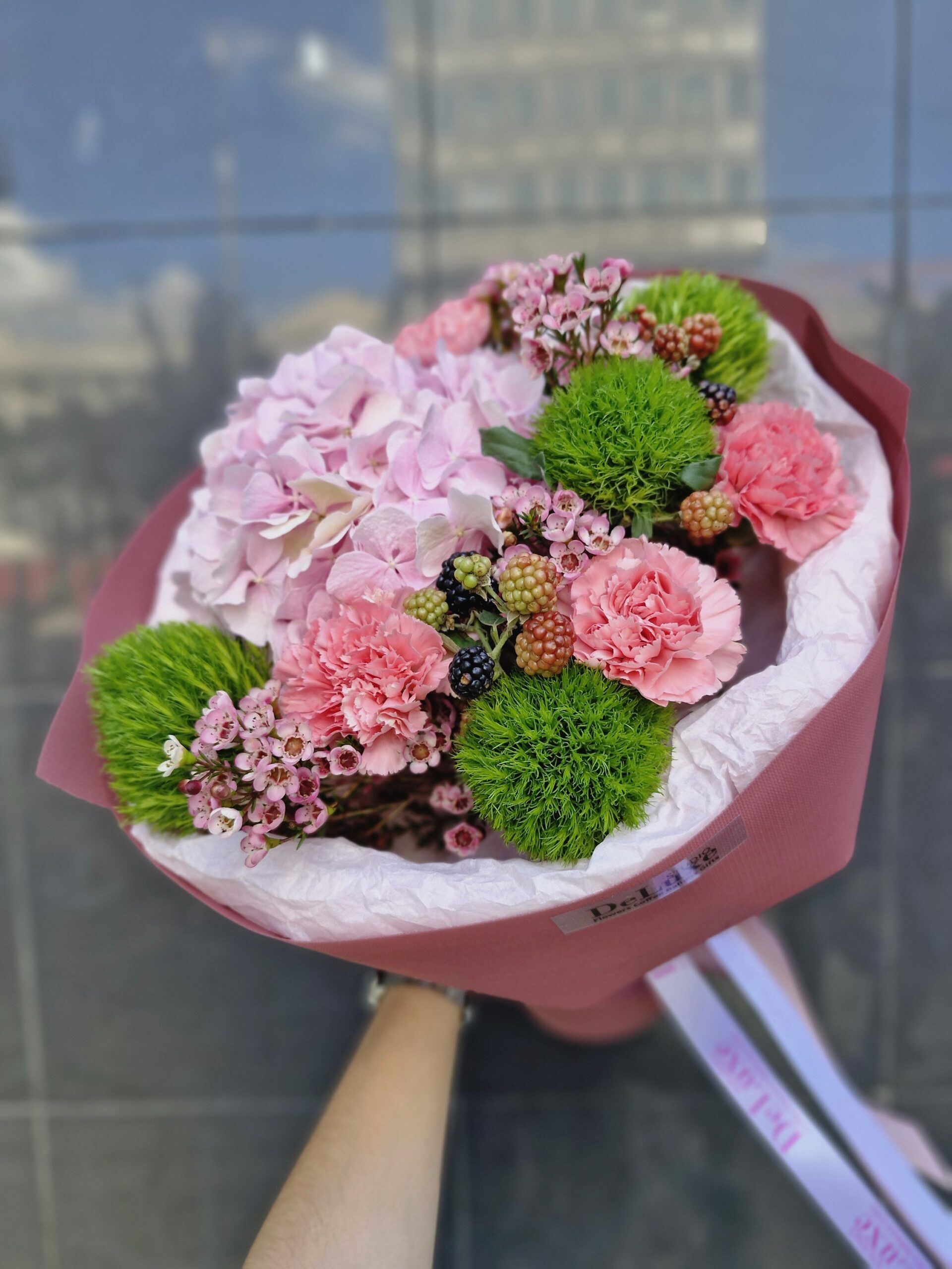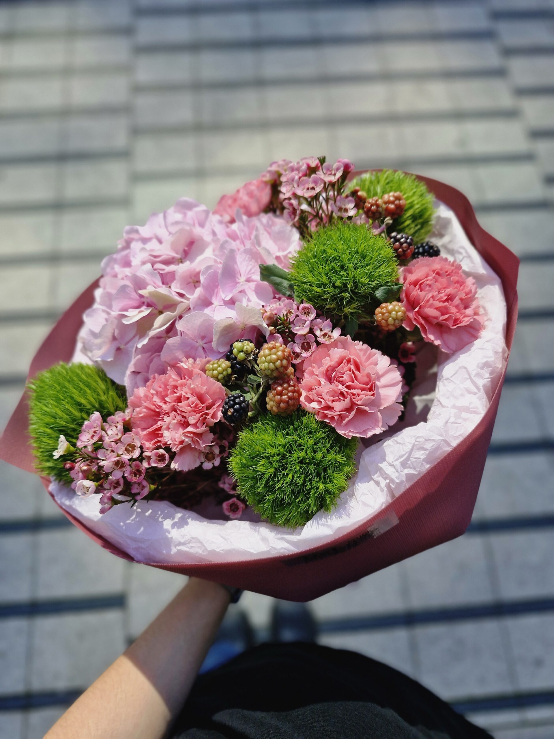 W bukiecie znajdują się jasnoróżowe hortensje, które nadają całości lekkości i objętości, intensywnie różowe goździki wprowadzające romantyczny akcent, oraz zielone, kuliste goździki – nowoczesny, kontrastowy element. Między nimi delikatnie wplecione są różowe woskówki i gałązki z jeżynami, które dodają naturalnego uroku i odrobiny zaskoczenia.