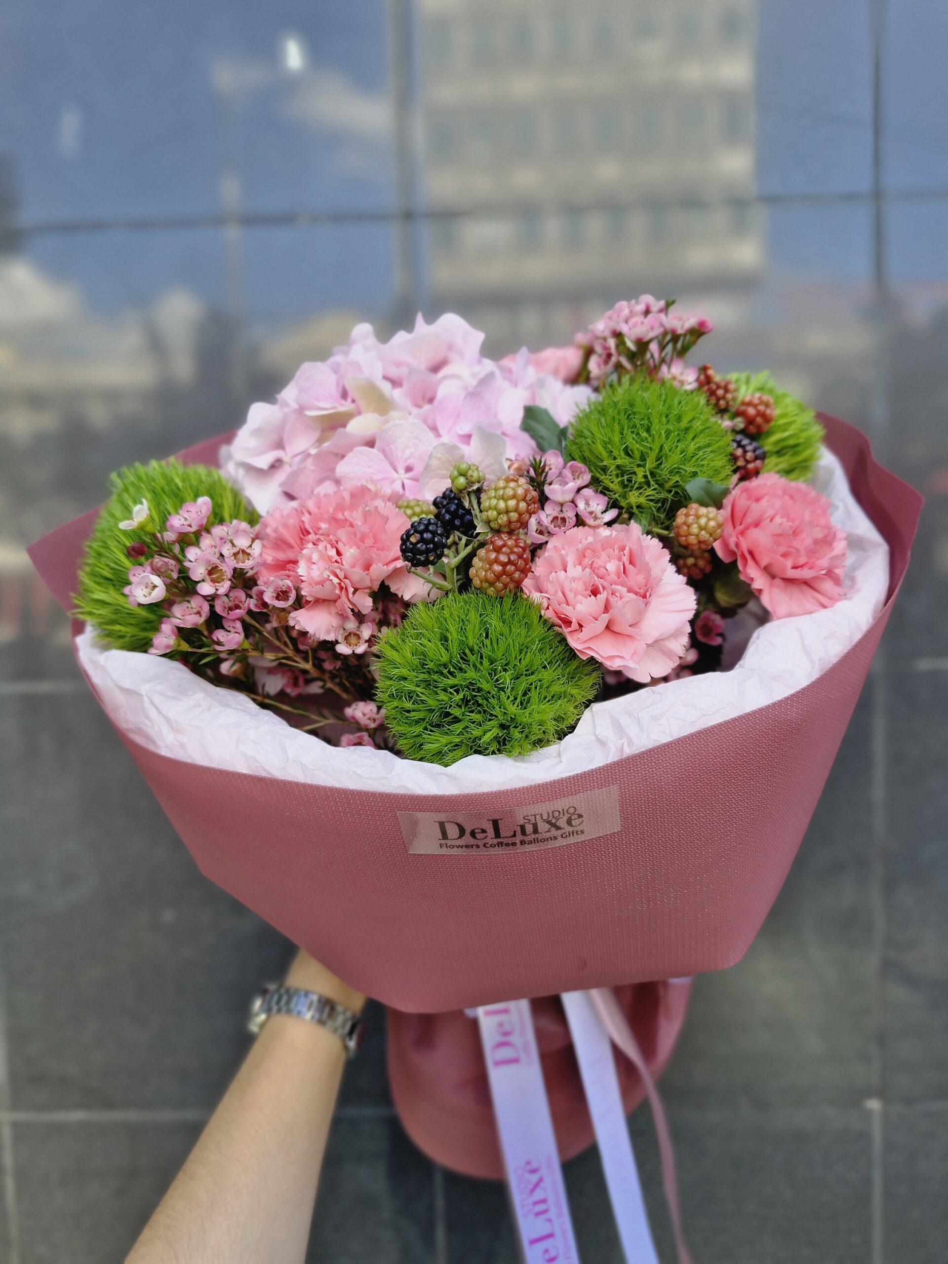 Bukiet z hortensji, goździków i jeżynami łączy romantyczny róż i świeżą zieleń w eleganckiej kompozycji. Zamów w Studio Deluxe Poznań.