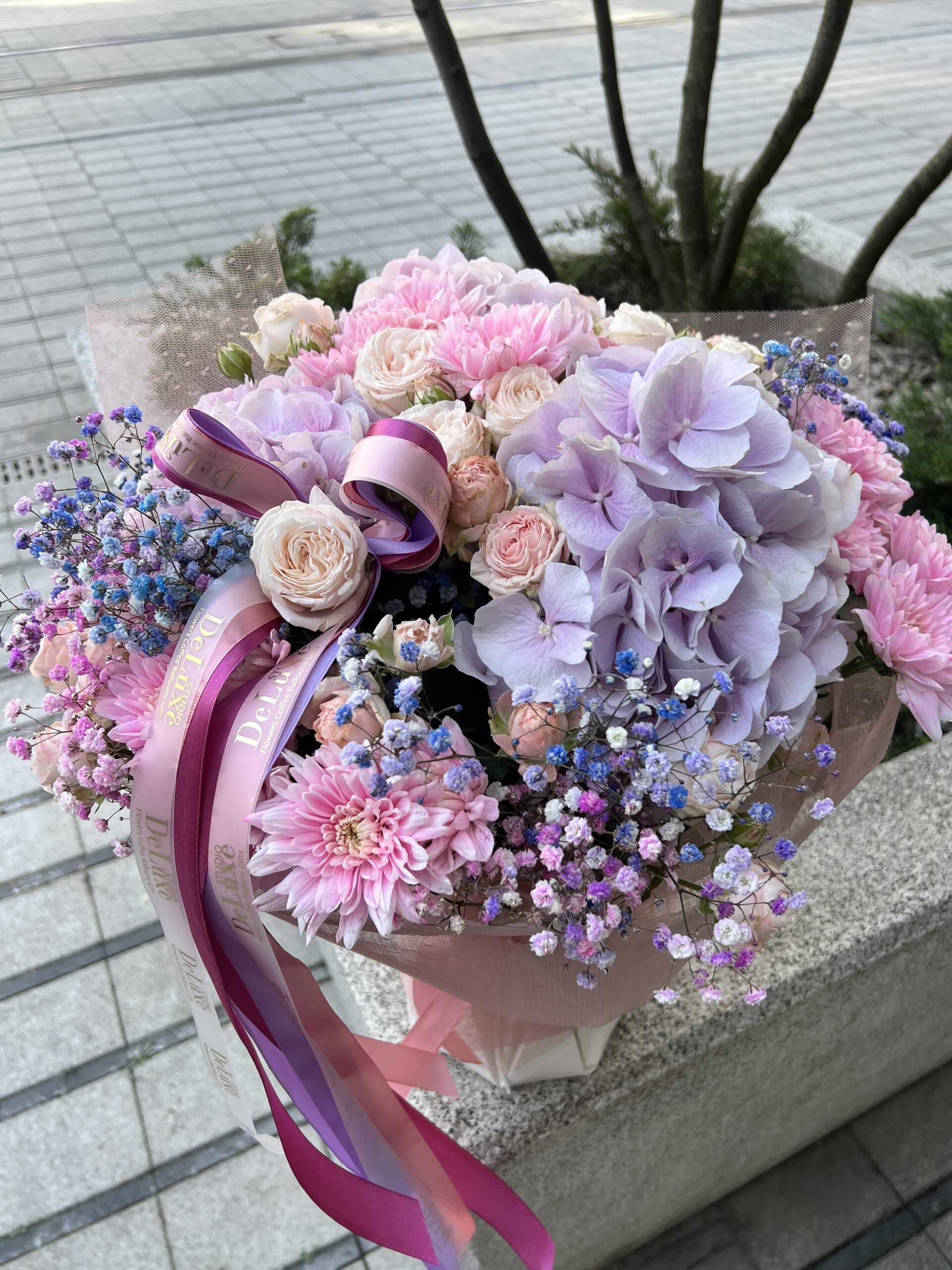 Wyjątkowy bukiet w pastelowych odcieniach różu, błękitu i fioletu. Delikatne kwiaty hortensji, róż gałązkowych, gipsówki i chryzantem tworzą romantyczną, lekką kompozycję pełną wdzięku. To elegancki wybór na prezent, rocznicę lub wyjątkową okazję.
