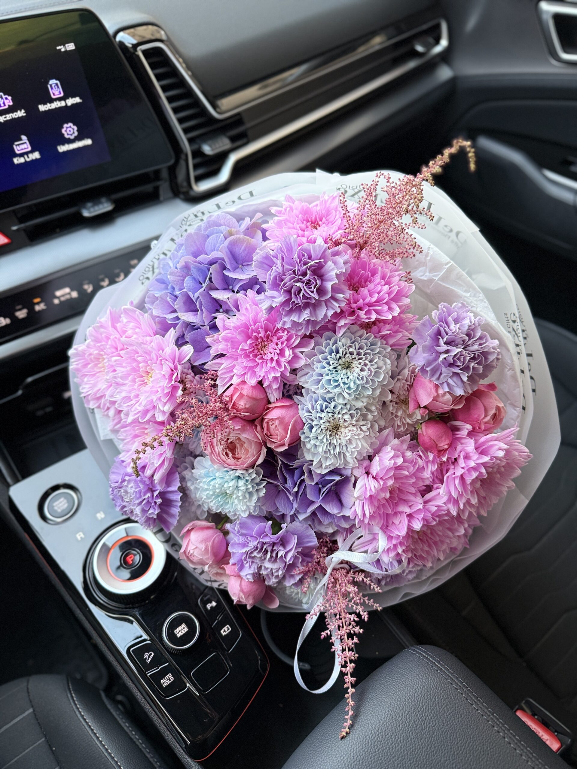 W kompozycji znalazły się goździki, hortensje i chryzantemy gałązkowe, które dodają bukietowi objętości i elegancji. To propozycja idealna na rocznicę, urodziny lub jako wyjątkowy gest wdzięczności.