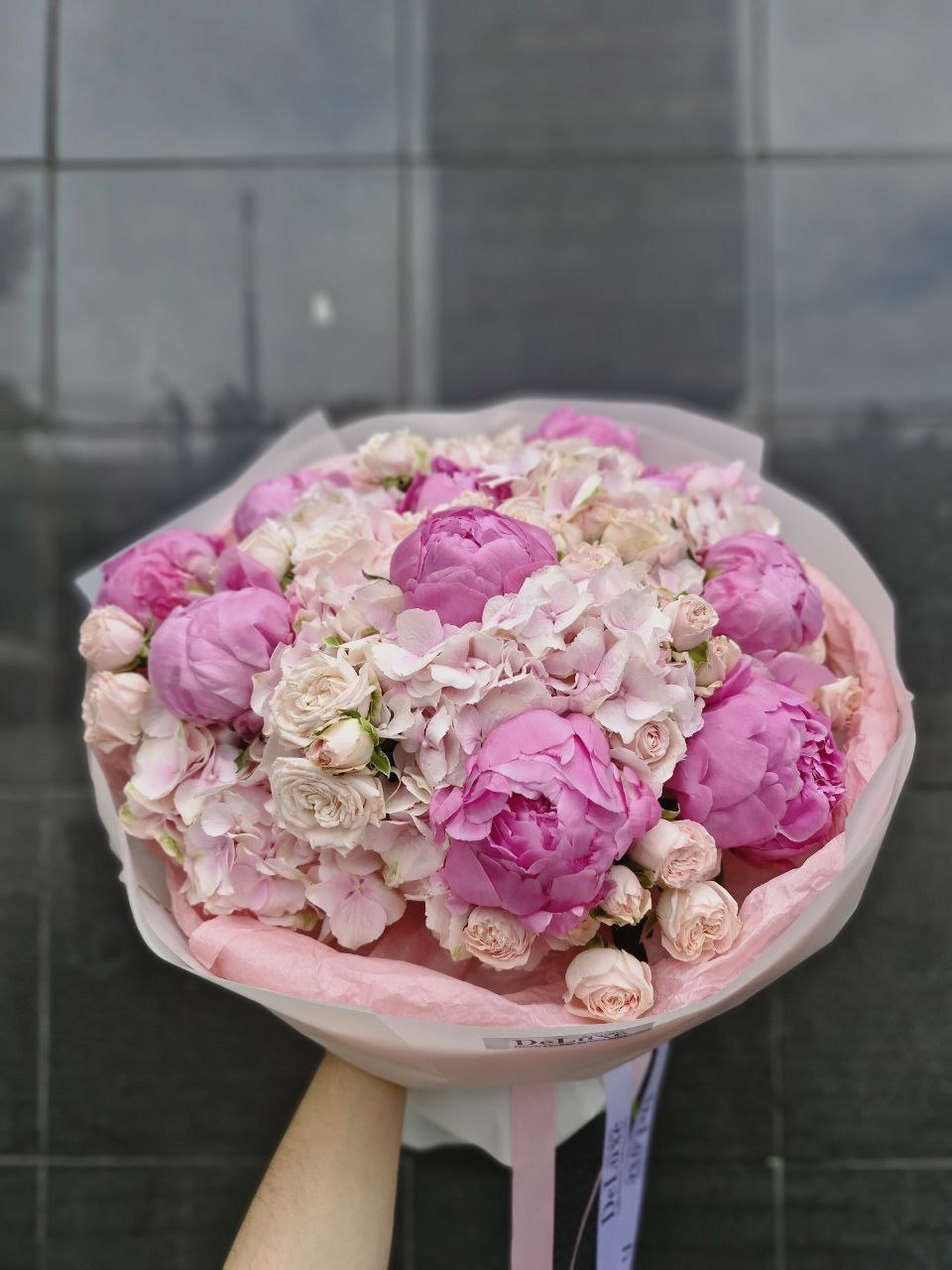 Delikatne, puszyste piwonie nadają bukietowi miękkości i kobiecego wdzięku. Ich pełne, wielowarstwowe kwiaty zachwycają bogactwem płatków i naturalnym zapachem. Pastelowe hortensje wprowadzają objętość, lekkość i efektowną formę, stanowiąc eleganckie tło dla całości.
