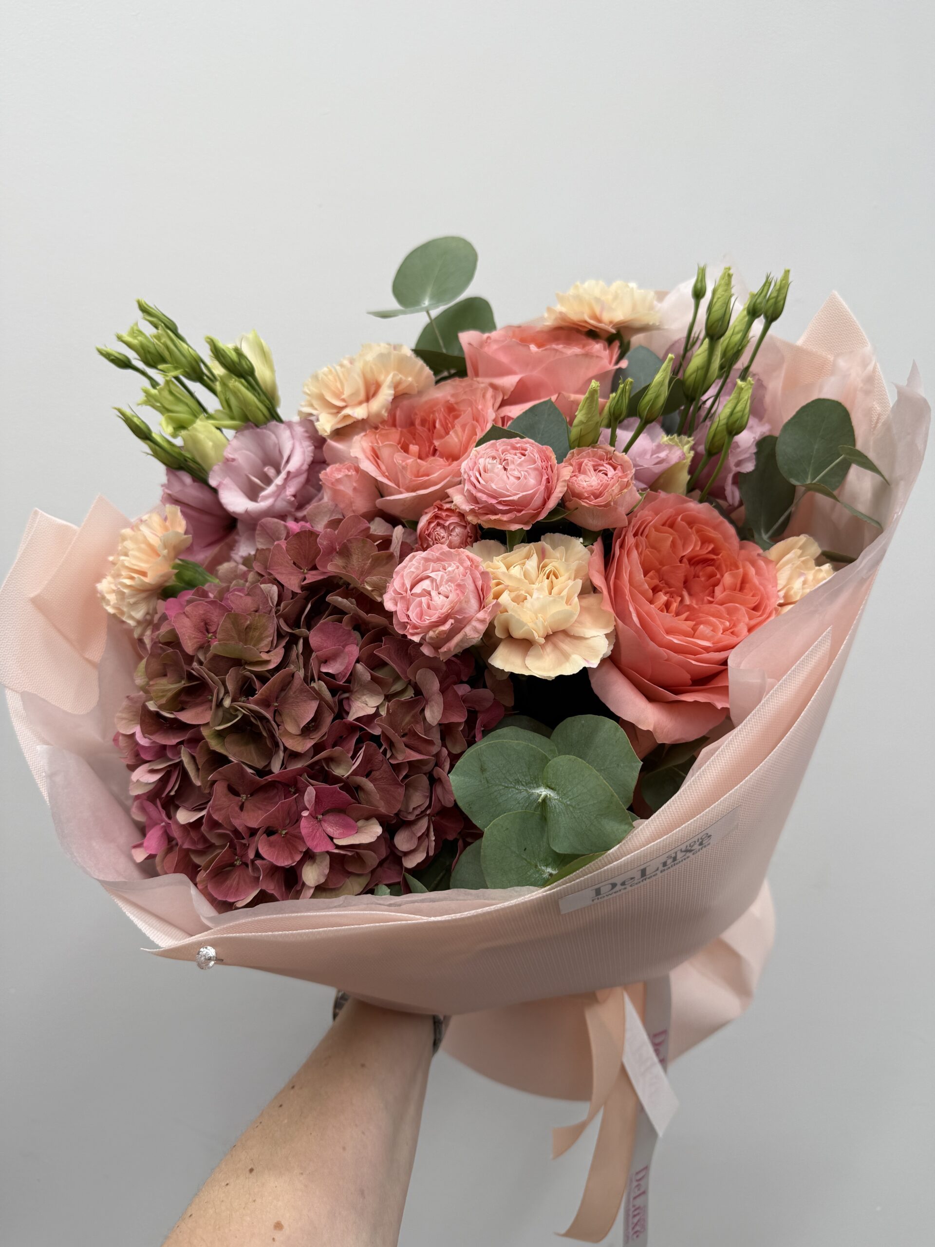 W kompozycji dominują miękka hortensja, pełne wdzięku róże i eustomy, romantyczne goździki oraz świeży eukaliptus, który dodaje lekkości. Pastelowe odcienie różu, kremu i moreli tworzą ponadczasowy, elegancki efekt.
