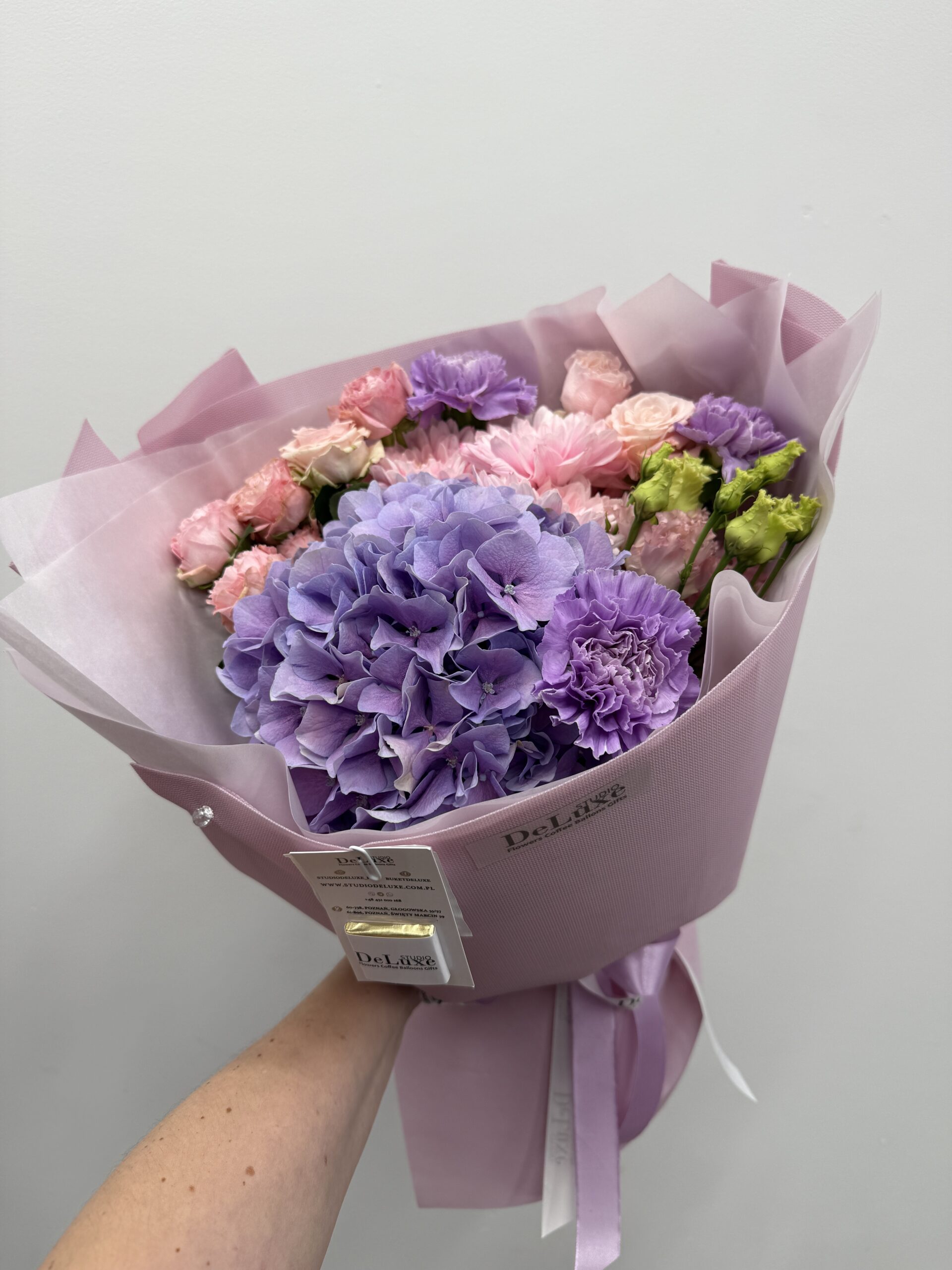 Poznaj elegancki bukiet z hortensji, chryzantem, eustom i róż – pastelową kompozycję pełną harmonii i lekkości. Ręcznie układany przez florystów Studio Deluxe w Poznaniu.