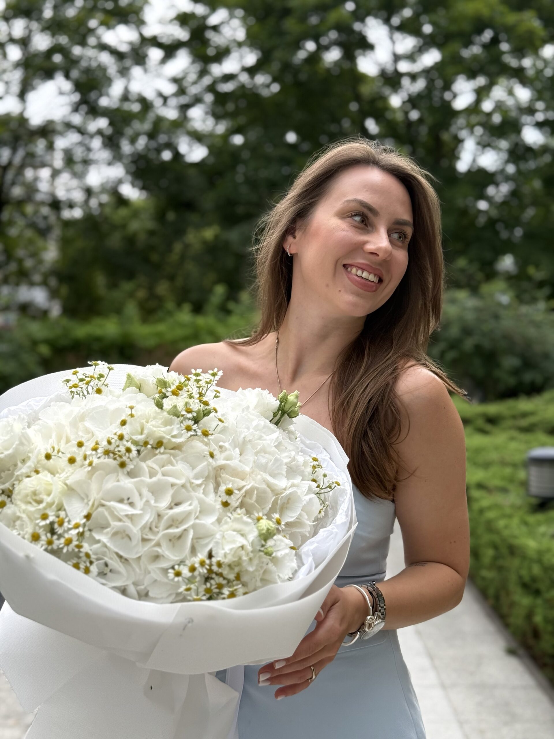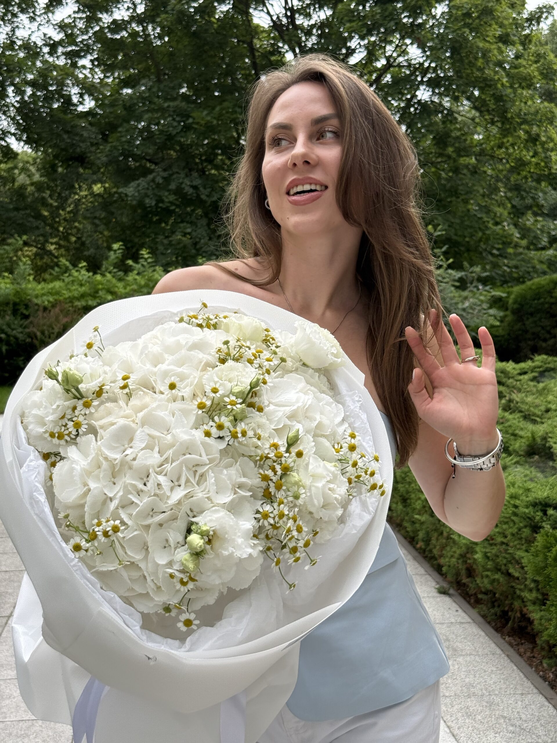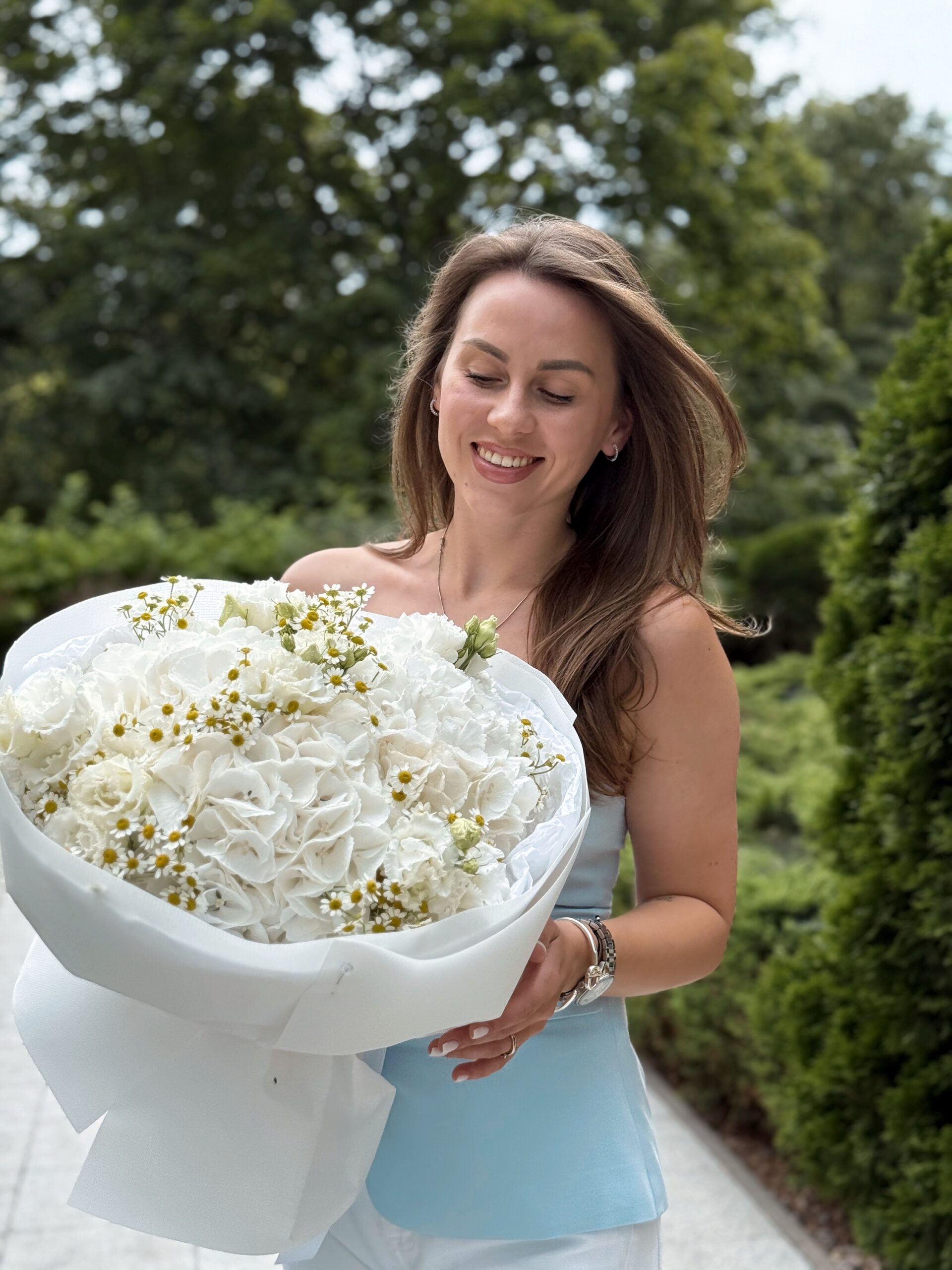 Wyjątkowa kompozycja, która łączy elegancję, świeżość i subtelny urok. Bukiet składa się z hortensji, tanacetuma i eustomy, tworząc harmonijną mieszankę różnych kształtów, kolorów i tekstur. Każdy kwiat wnosi do bukietu wyjątkowy charakter – hortensje dodają objętości, tanacetum świeżości, a eustoma delikatności i romantyzmu.