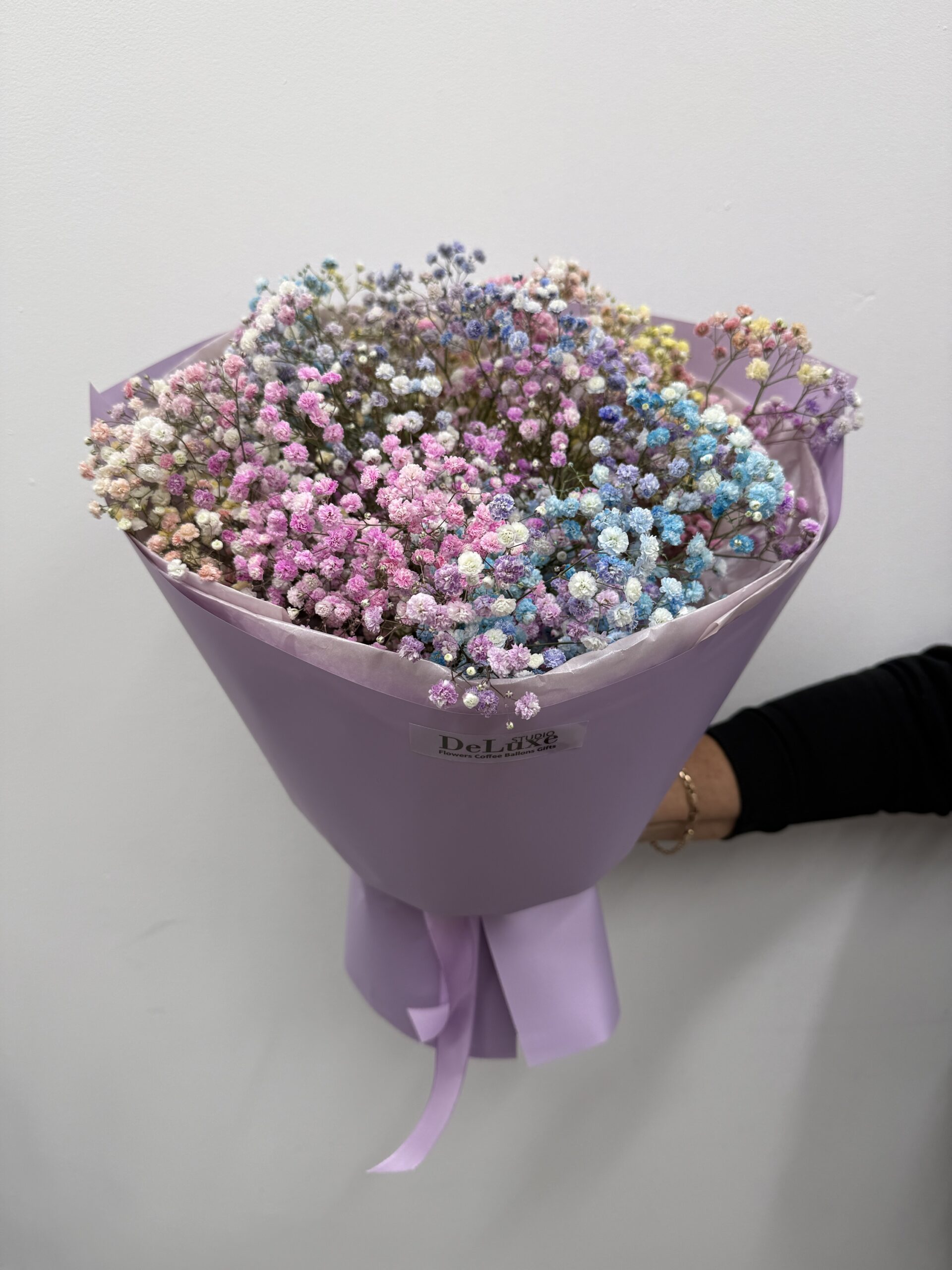 Ten bukiet z kolorowej gipsówki to prawdziwy festiwal barw i pozytywnej energii. Drobne kwiatki w odcieniach różu, błękitu, żółci i fioletu tworzą lekką, radosną kompozycję, która doskonale sprawdzi się jako prezent na urodziny, imieniny lub ozdoba wnętrza.
