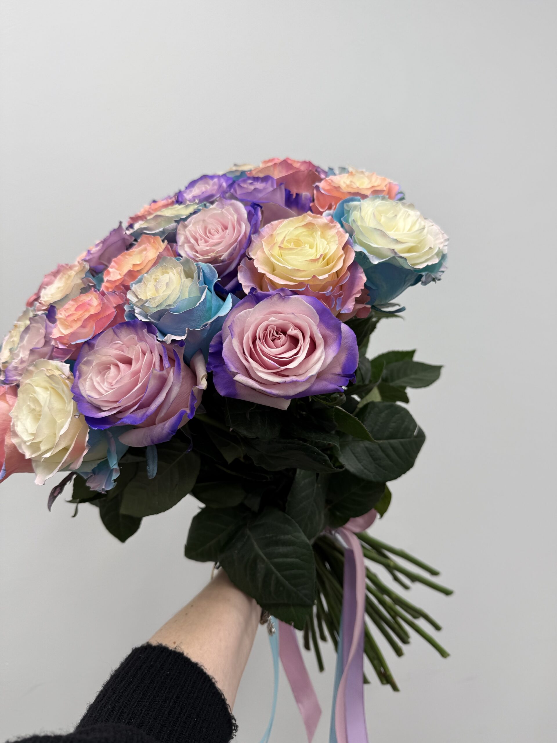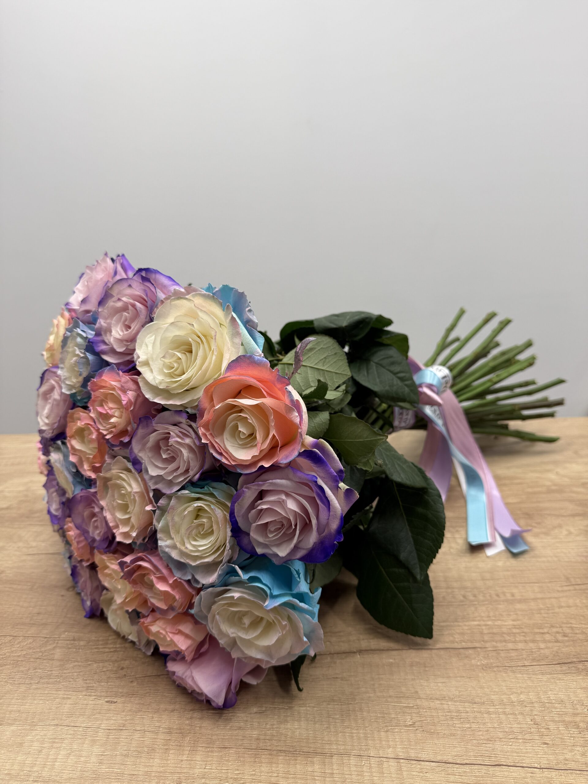 Ten wyjątkowy bukiet z kolorowych róż to prawdziwa uczta dla zmysłów – kompozycja, która łączy w sobie róże w różnych odcieniach, od subtelnych pasteli po intensywne barwy. Emanuje elegancją, świeżością i pozytywną energią, tworząc harmonijną całość.