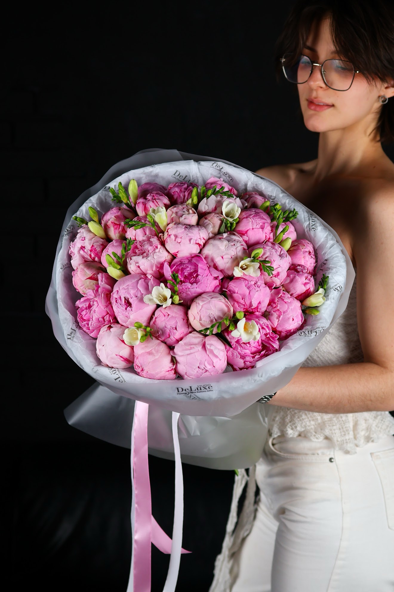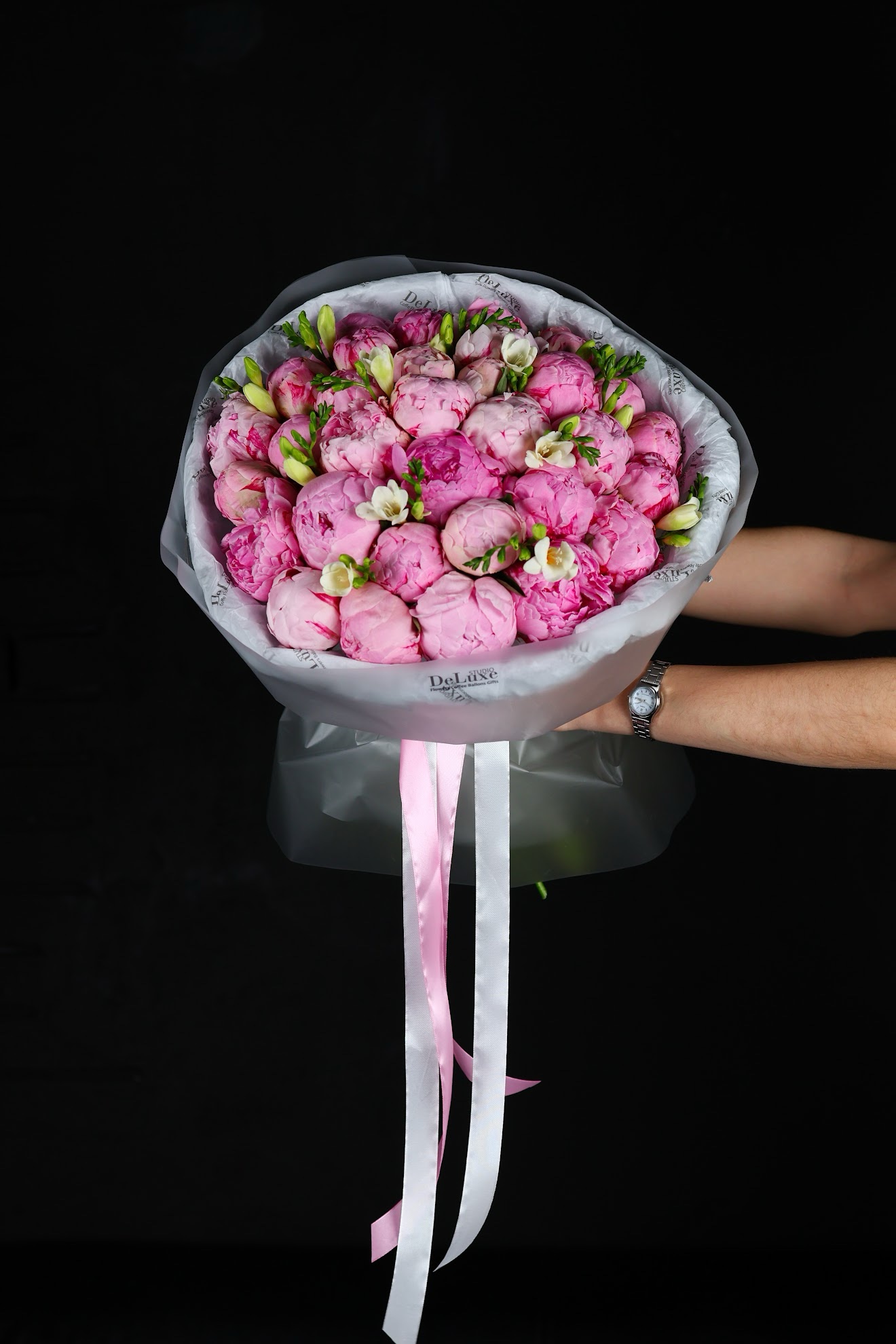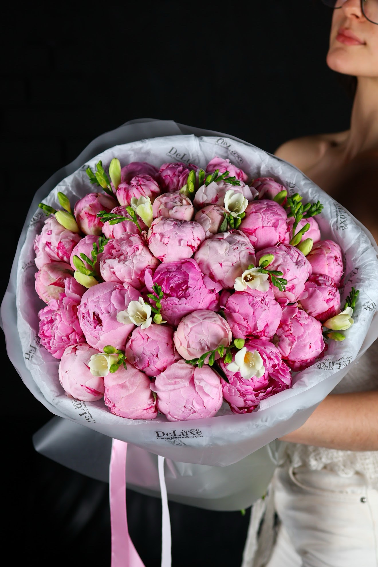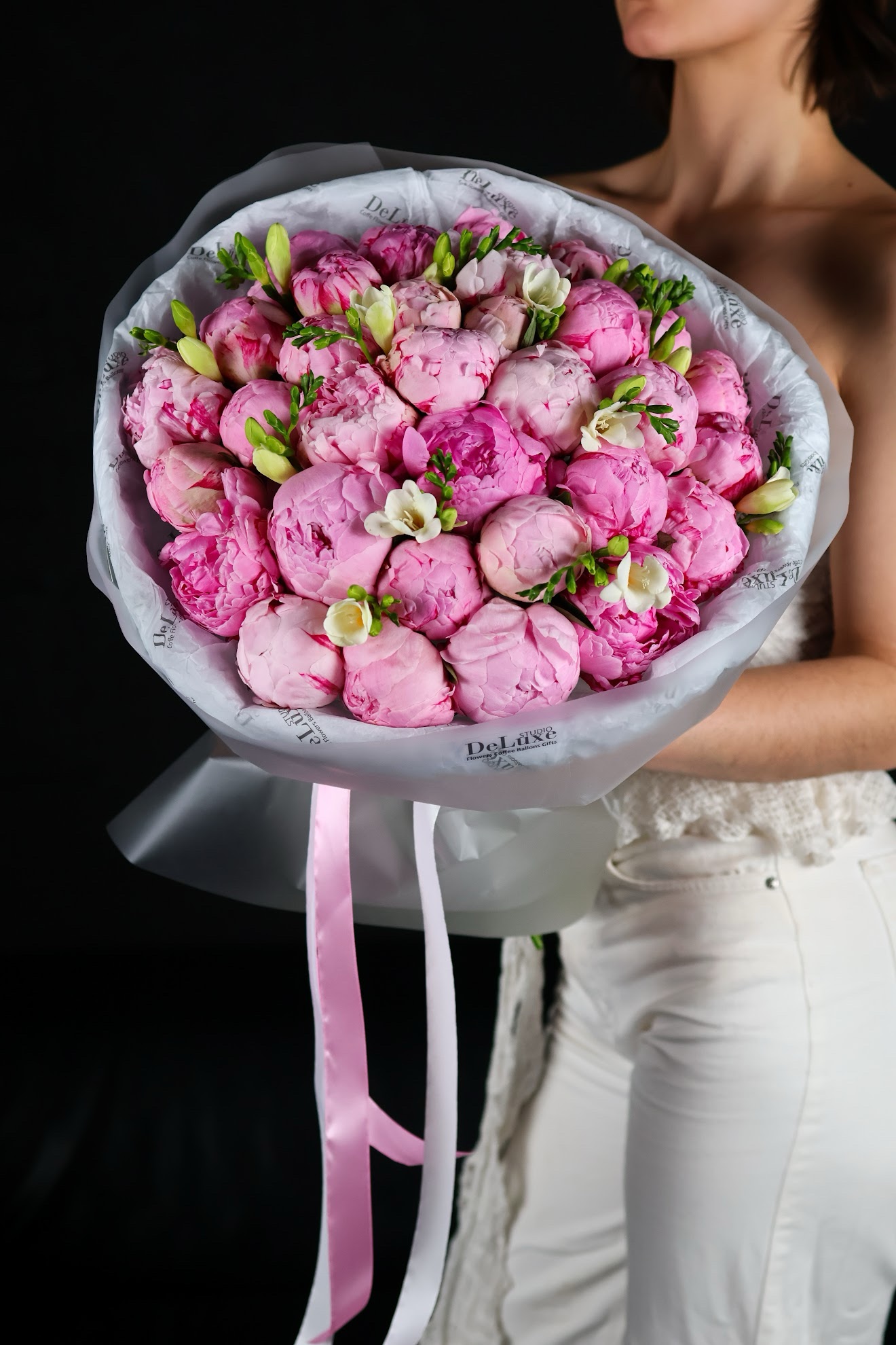 Bukiet z piwonii i frezji. Elegancka, pachnąca kompozycja z dostawą w Poznaniu. Zamów kwiaty online w Studio Deluxe.