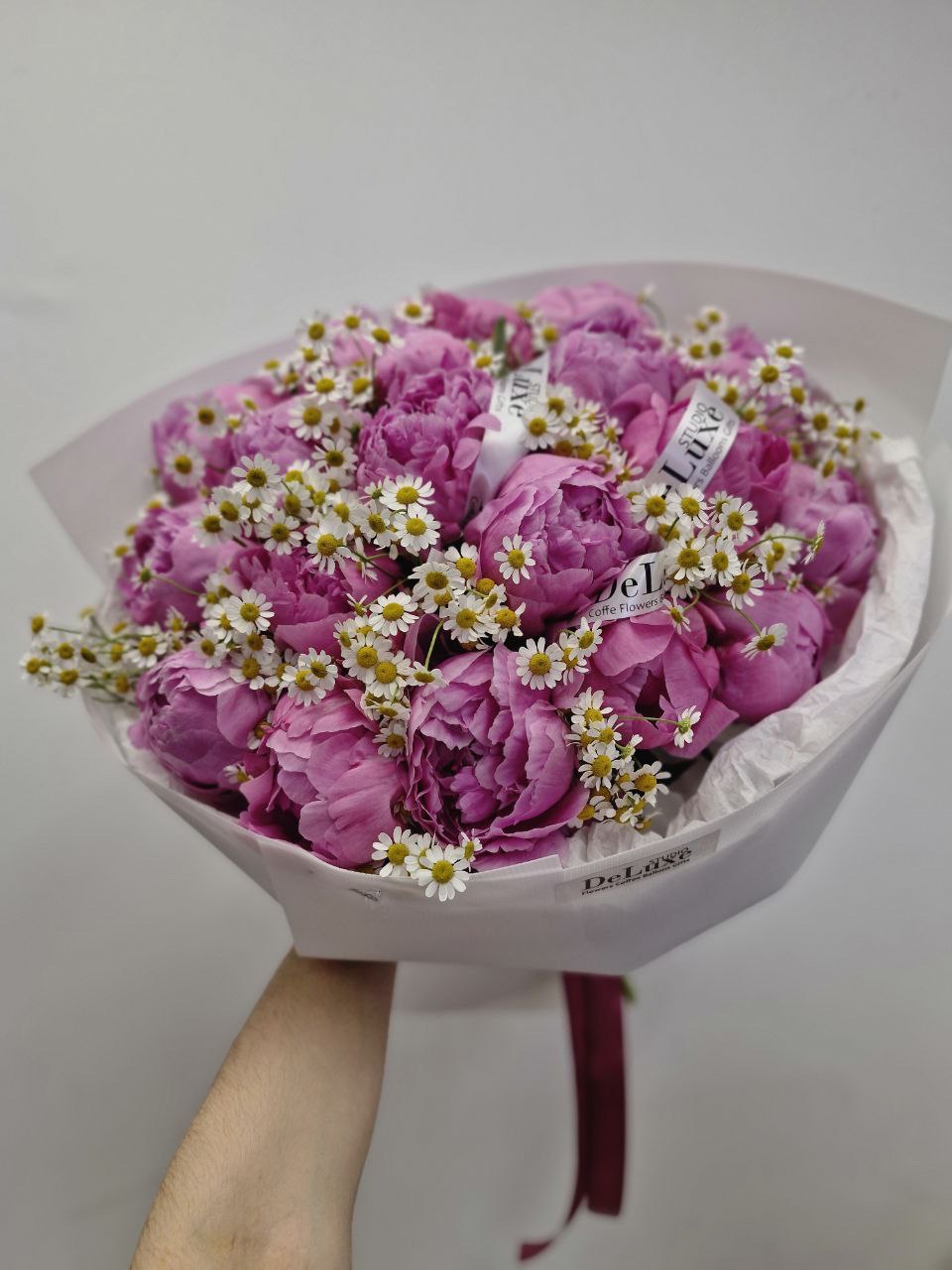 Bukiet z piwonii i rumianku to harmonijne zestawienie luksusu i lekkości. Pełne, aksamitne piwonie w odcieniach pudrowego różu, bieli lub głębokiego różu stanowią serce kompozycji, nadając jej romantyczny i elegancki charakter.