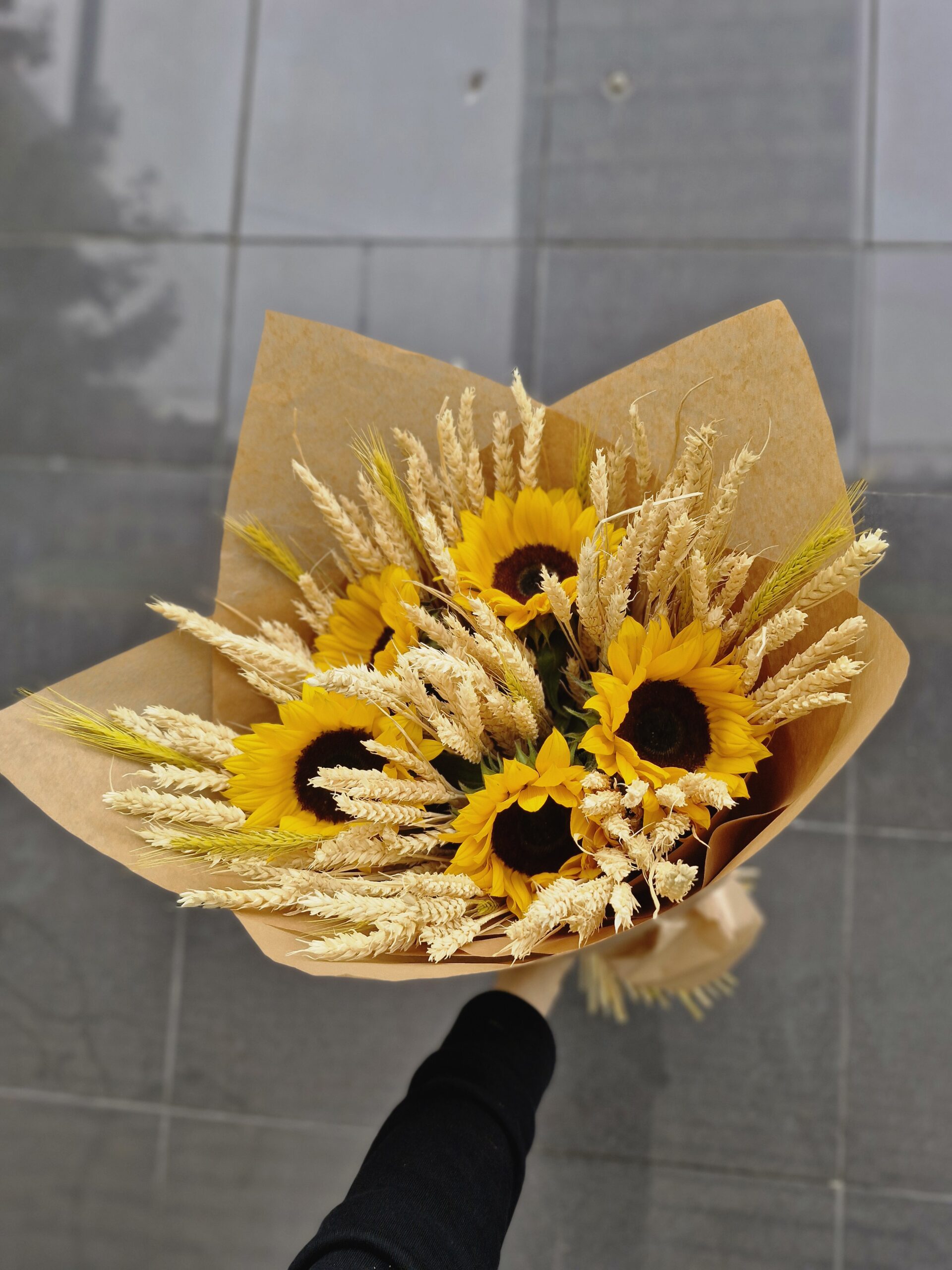 Rustykalny bukiet ze słonecznika i zboża – naturalna kompozycja pełna ciepła i uroku. Studio Deluxe Poznań – eleganckie kwiaty na każdą okazję.