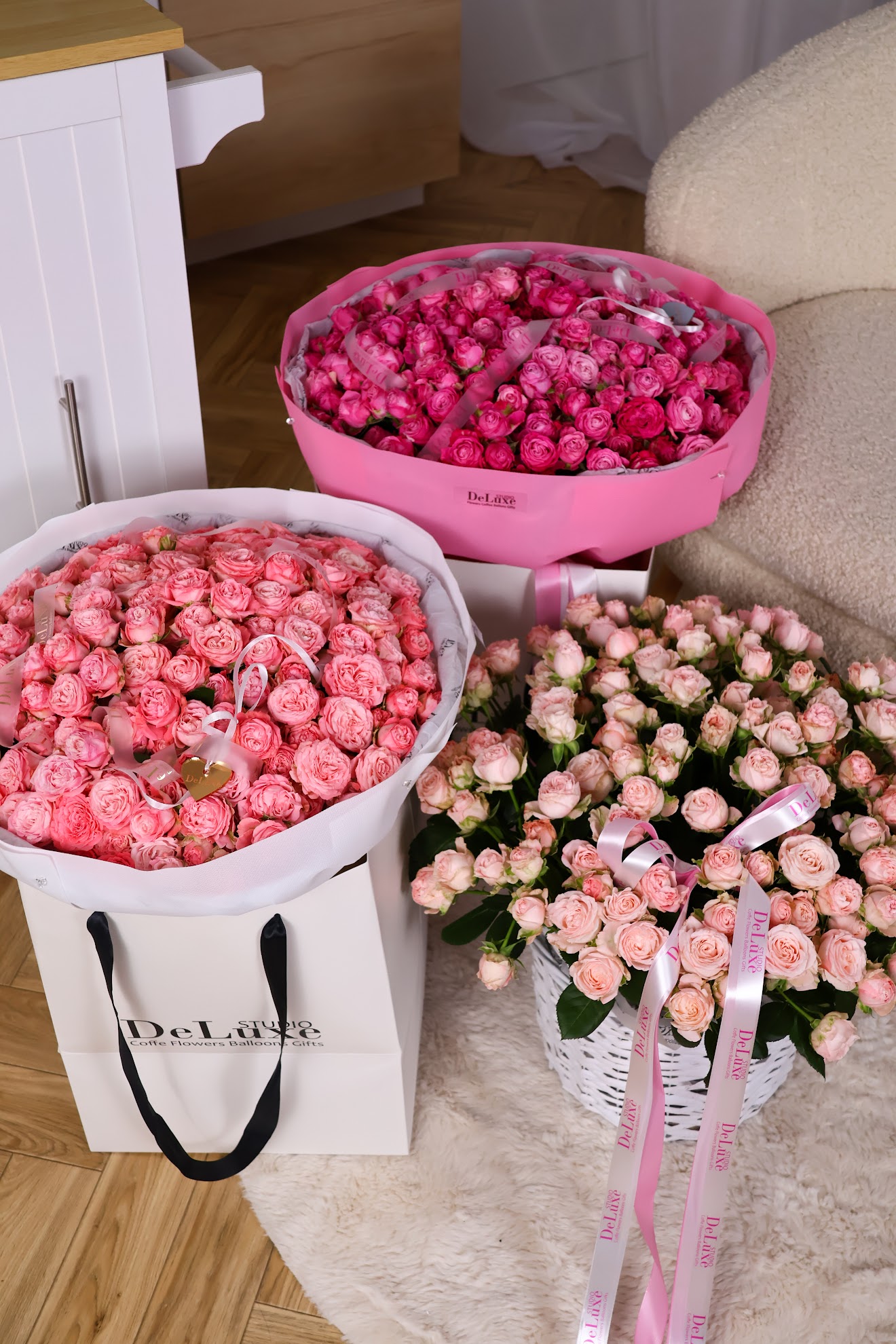 Imponujące bukiety z gałązkowych róż Bombastik – aż 153 szt. Luksusowa kompozycja z dostawą na terenie Poznania. Studio Deluxe.