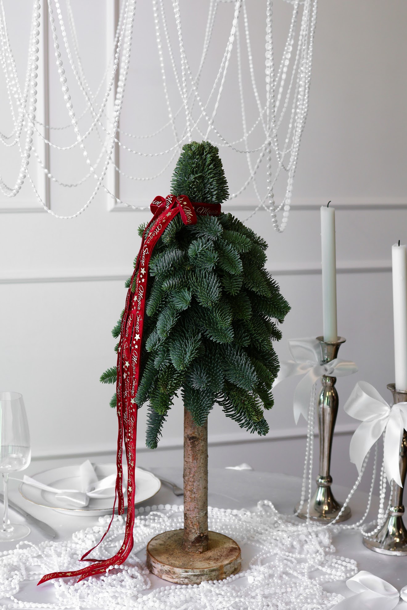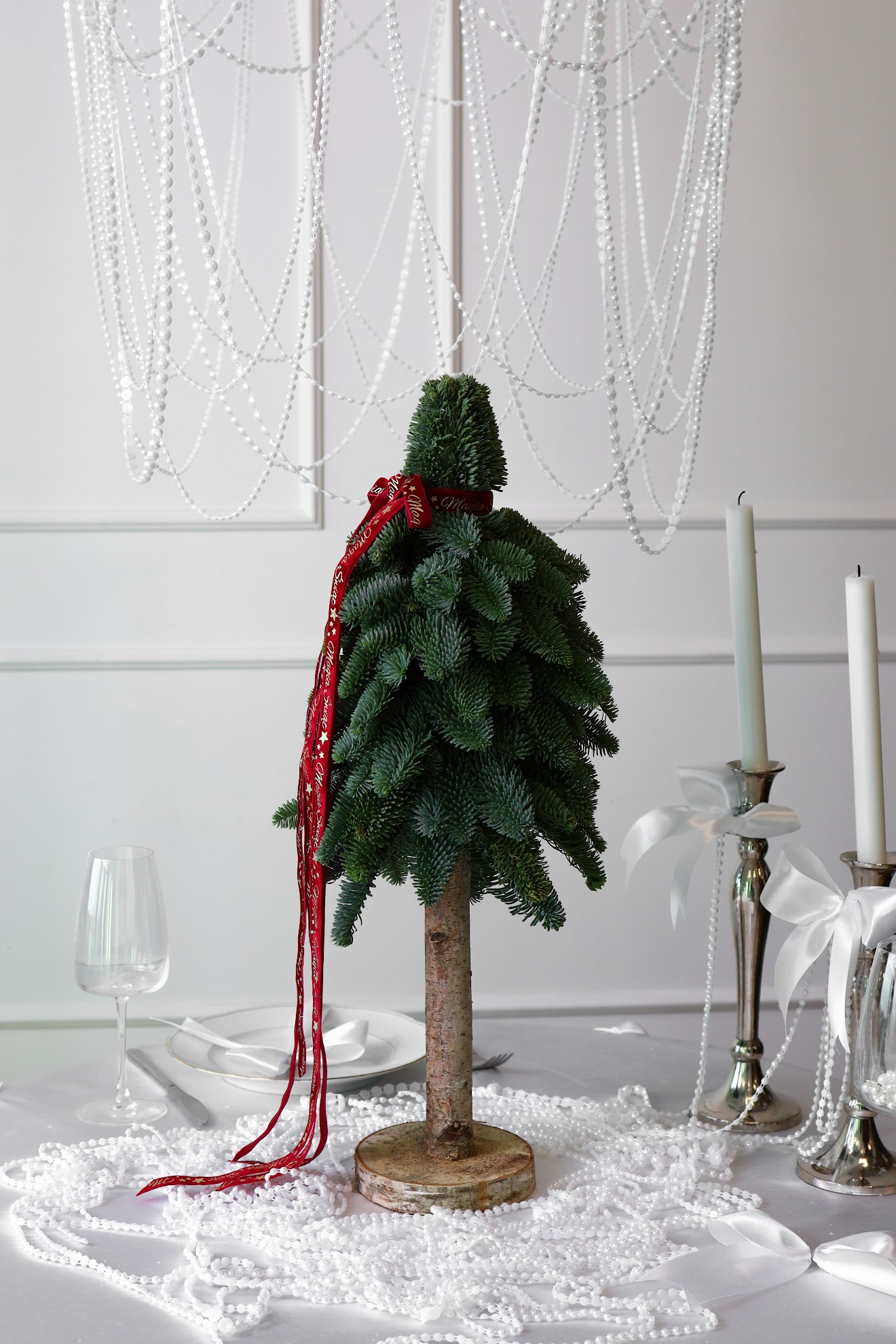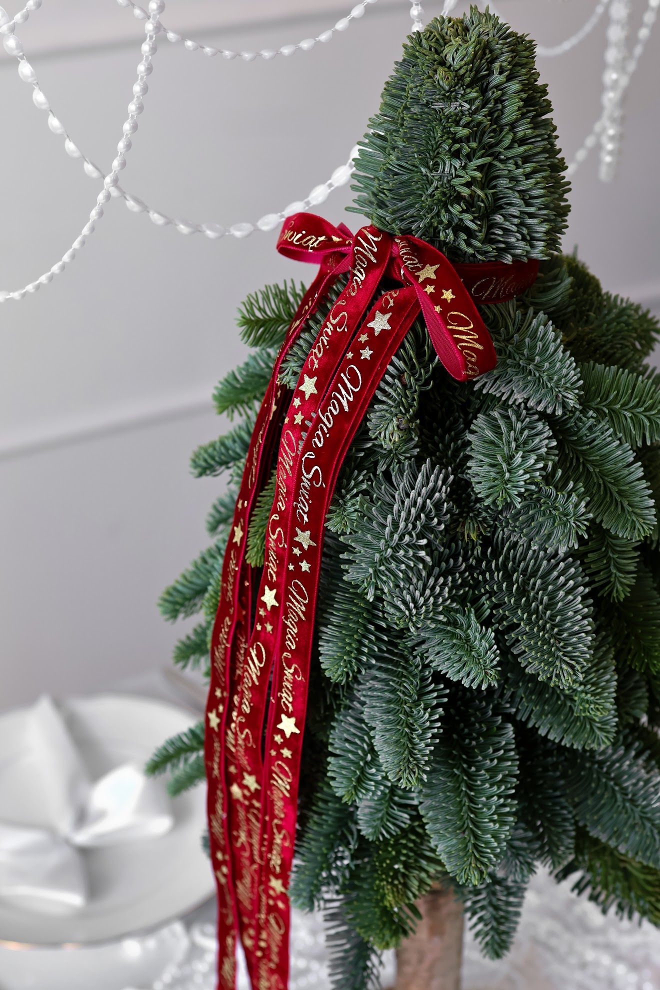 Choinka świąteczna z żywego nobilisa na naturalnej drewnianej podstawie, ozdobiona czerwoną wstążką. Minimalistyczna dekoracja Bożonarodzeniowa.